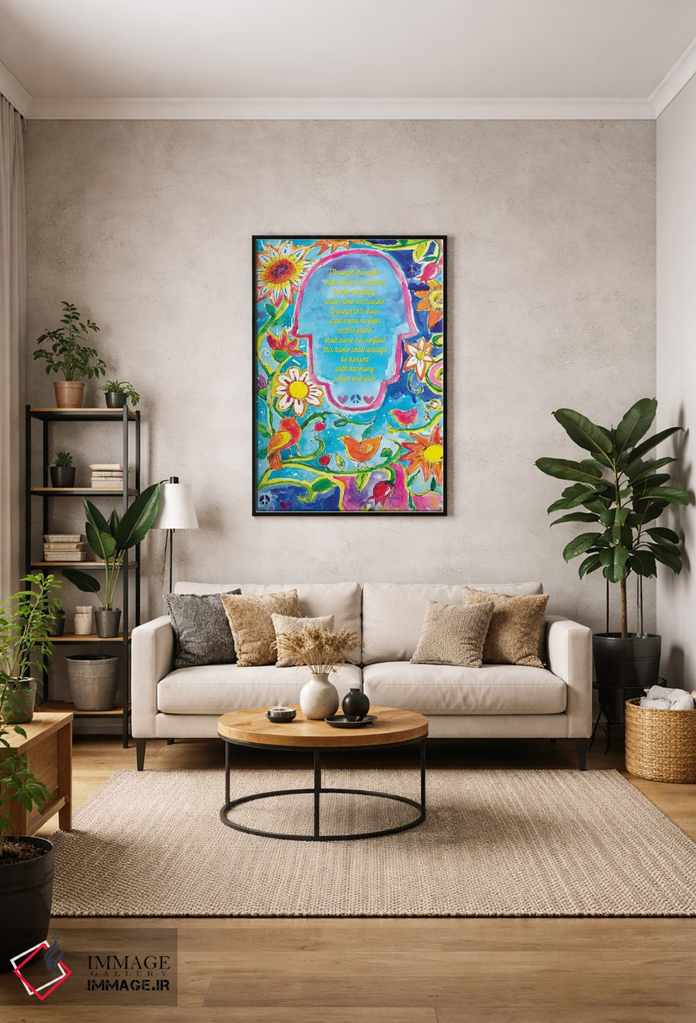 «برکت باغ عدن برای خانه» اثرِ «میشل پالور فلدمن» به فضا عمق میدهد؛ این اثر در اجرای هنری، برای دکورهای کلاسیک—مدرن یک نقطهی کانونی تمیز میسازد.
