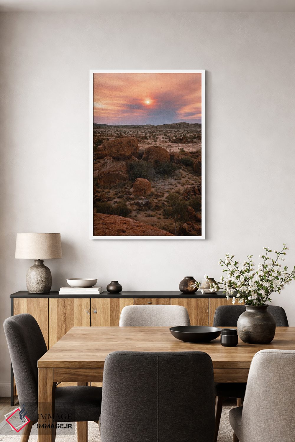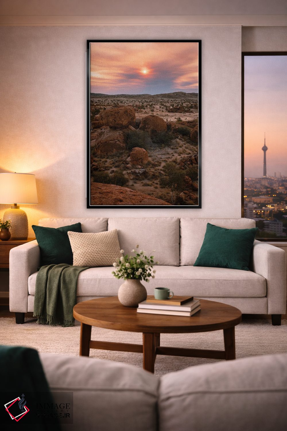 براساس پالت گرم اثر، قاب تیک گرم (چوبی) پیشنهاد اول است و مشکی مات (فریم متوسط) مکمل. برای سفارشهای پروژهای با ابعاد و قابهای اختصاصی با ایماژ در تماس باشید.