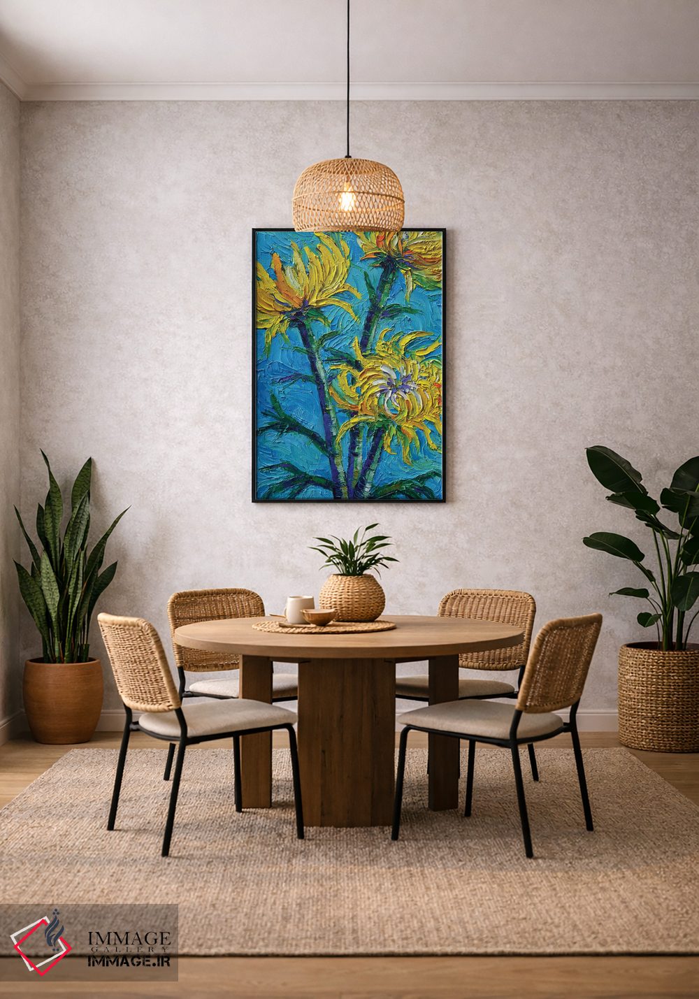 برای دیواری که دوست دارید «حرف داشته باشد»، «دسته گل داوودی» اثرِ «مونا ادولسکو» روی دیوار، تمیز و دقیق دیده میشود؛ برای فضاهایی که میخواهید مرکز توجه داشته باشند پیشنهاد میشود. به دیوار حس «تمامشده» میدهد.