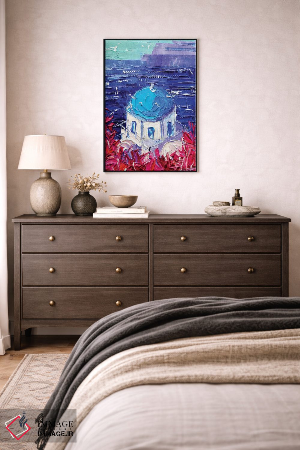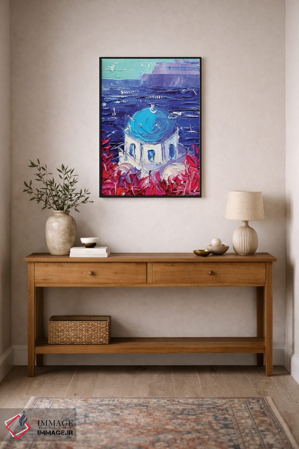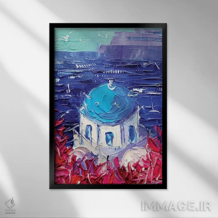 این اثر با عنوان «گنبد کلیسای سانتورینی» اثرِ «مونا ادولسکو»، برای دیوارهای شاخص و چیدمانهای سطحبالا مناسب است.