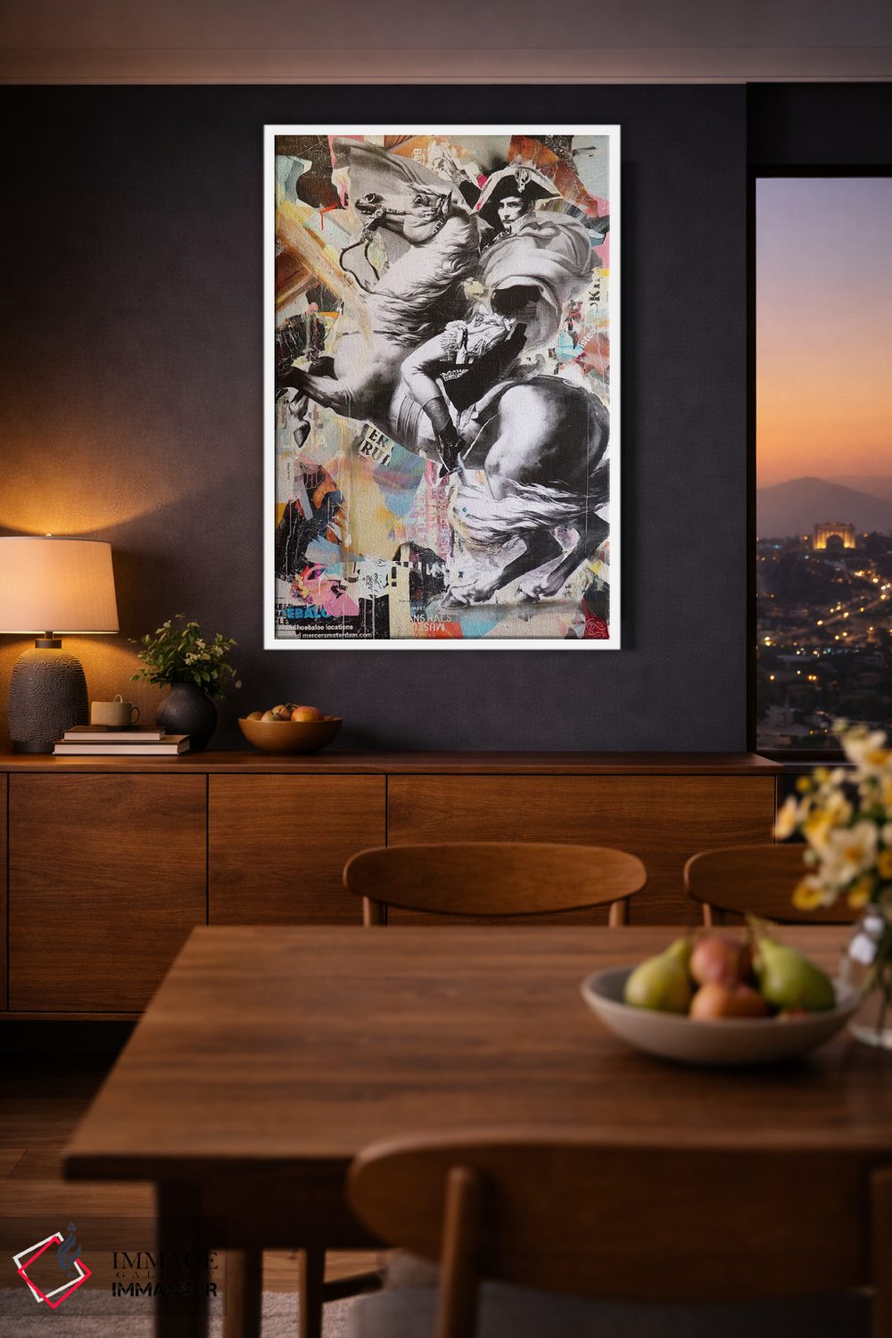 براساس پالت گرم اثر، قاب بلوط روشن (چوبی) پیشنهاد اول است و استخوانی ملایم مکمل. برای سفارشهای پروژهای با ابعاد و قابهای اختصاصی با ایماژ در تماس باشید.