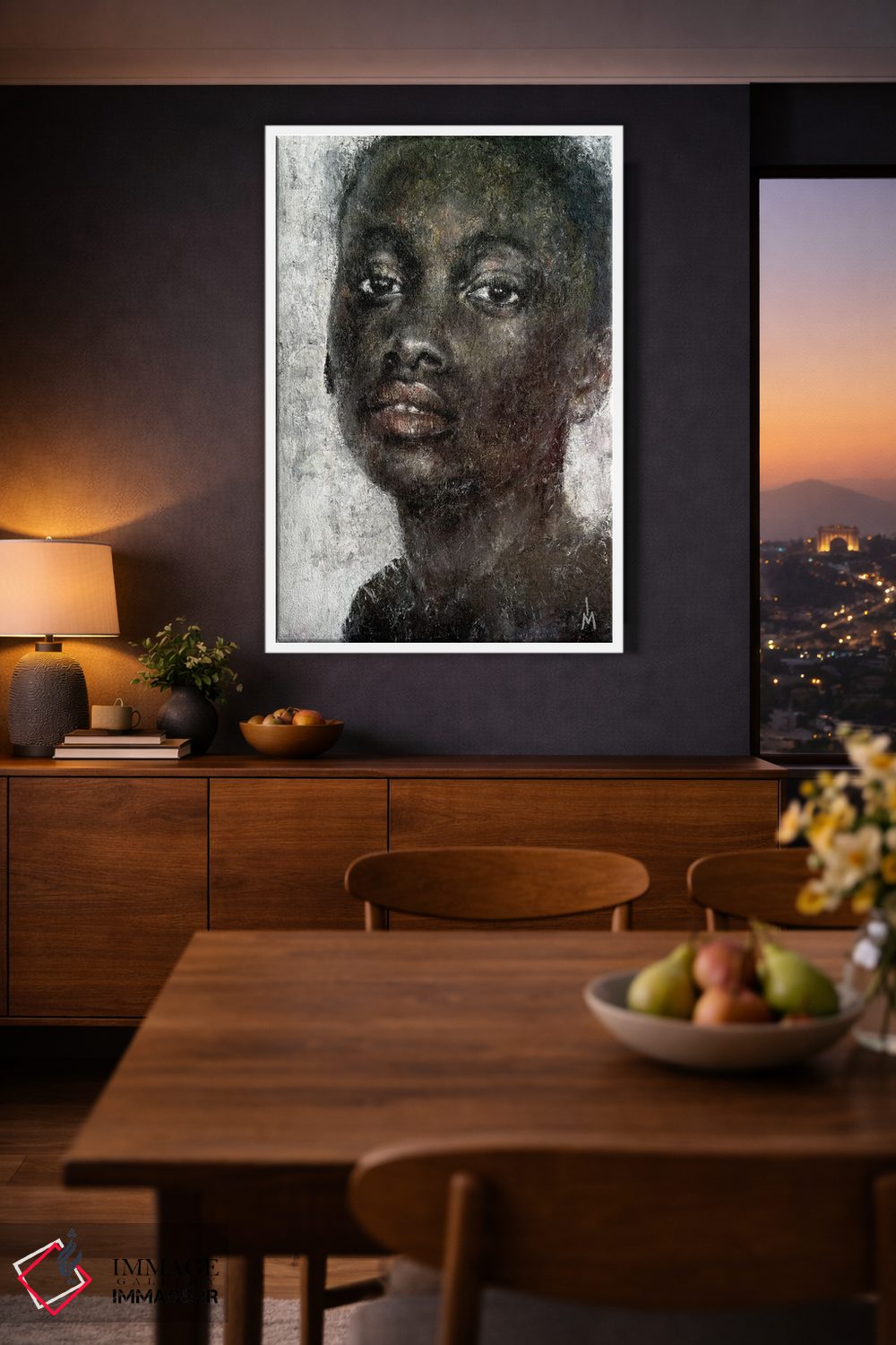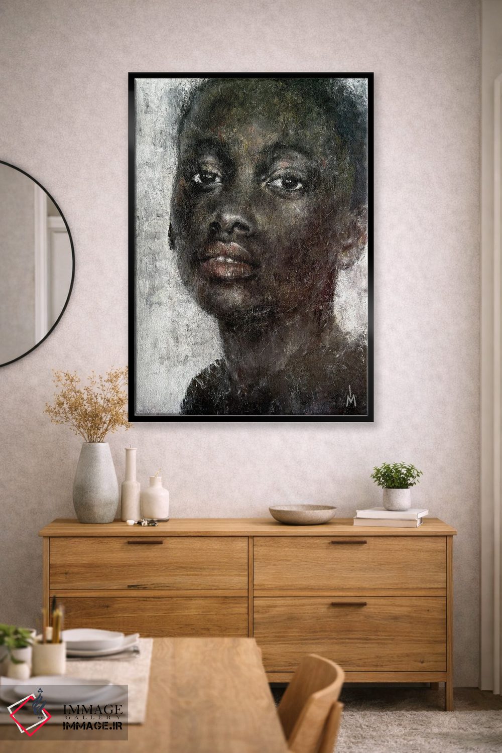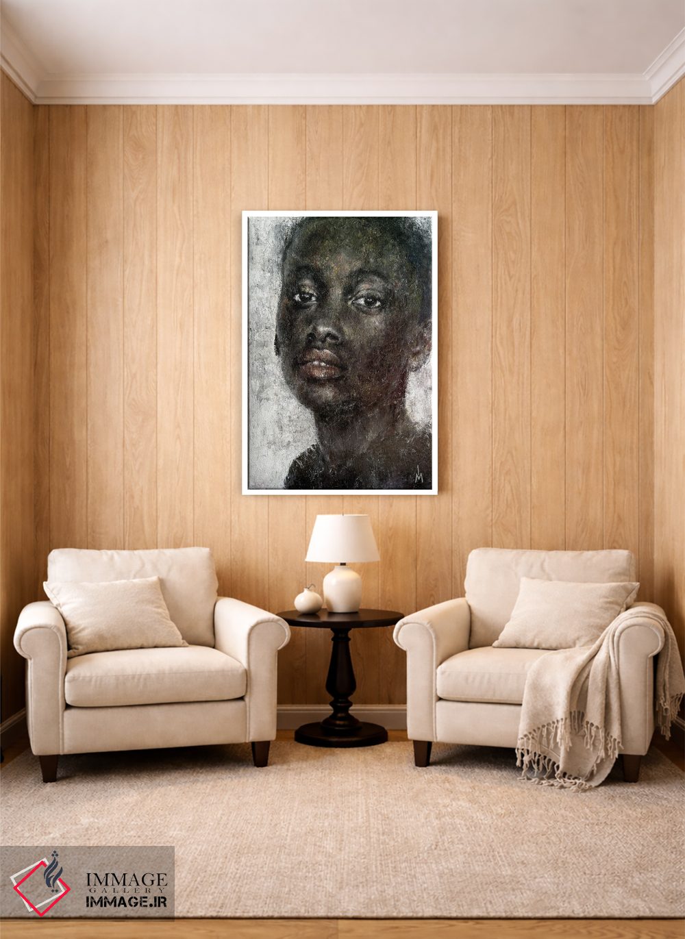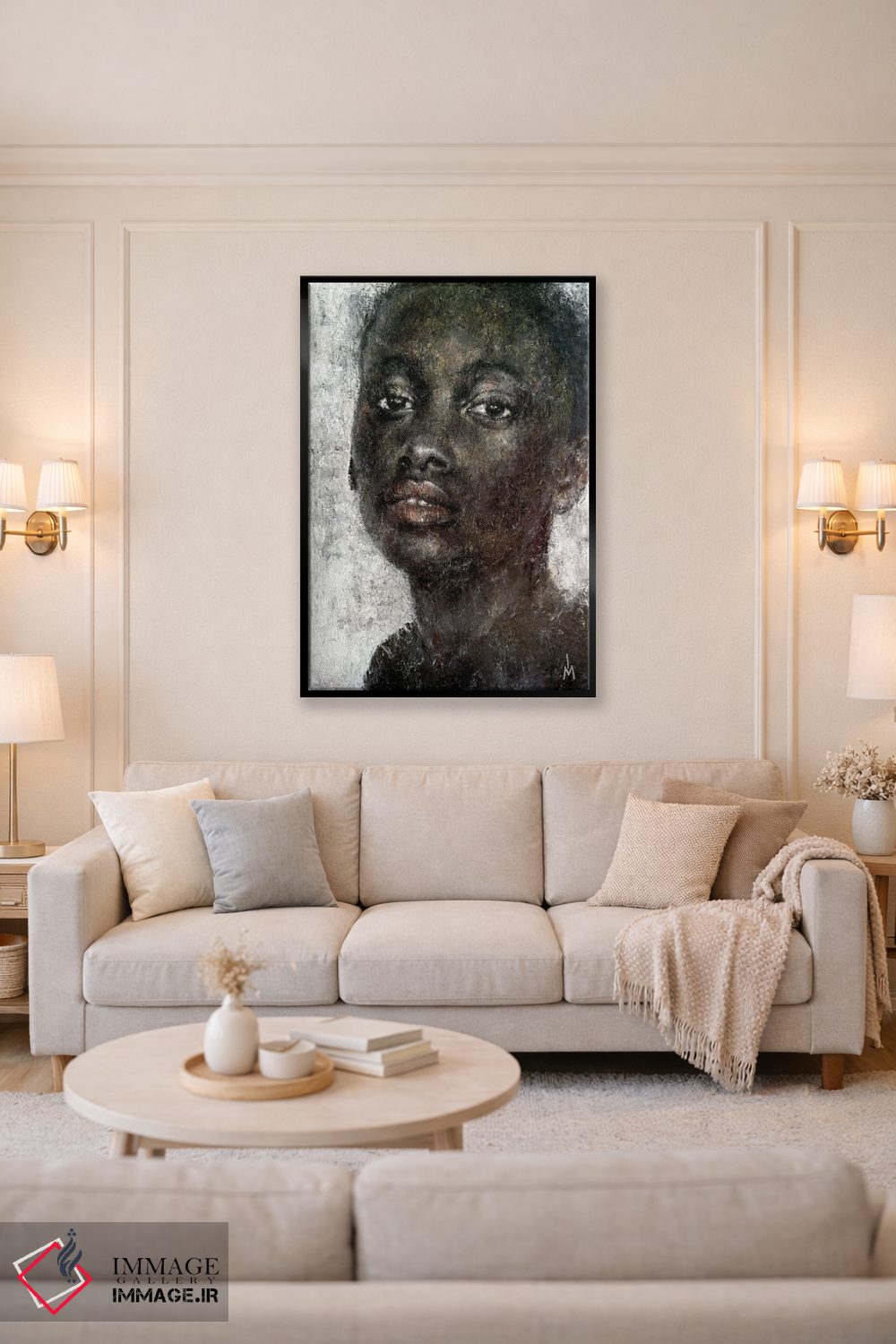 براساس پالت گرم اثر، قاب بلوط روشن (چوبی) پیشنهاد اول است و استخوانی ملایم مکمل. برای سفارشهای پروژهای با ابعاد و قابهای اختصاصی با ایماژ در تماس باشید.