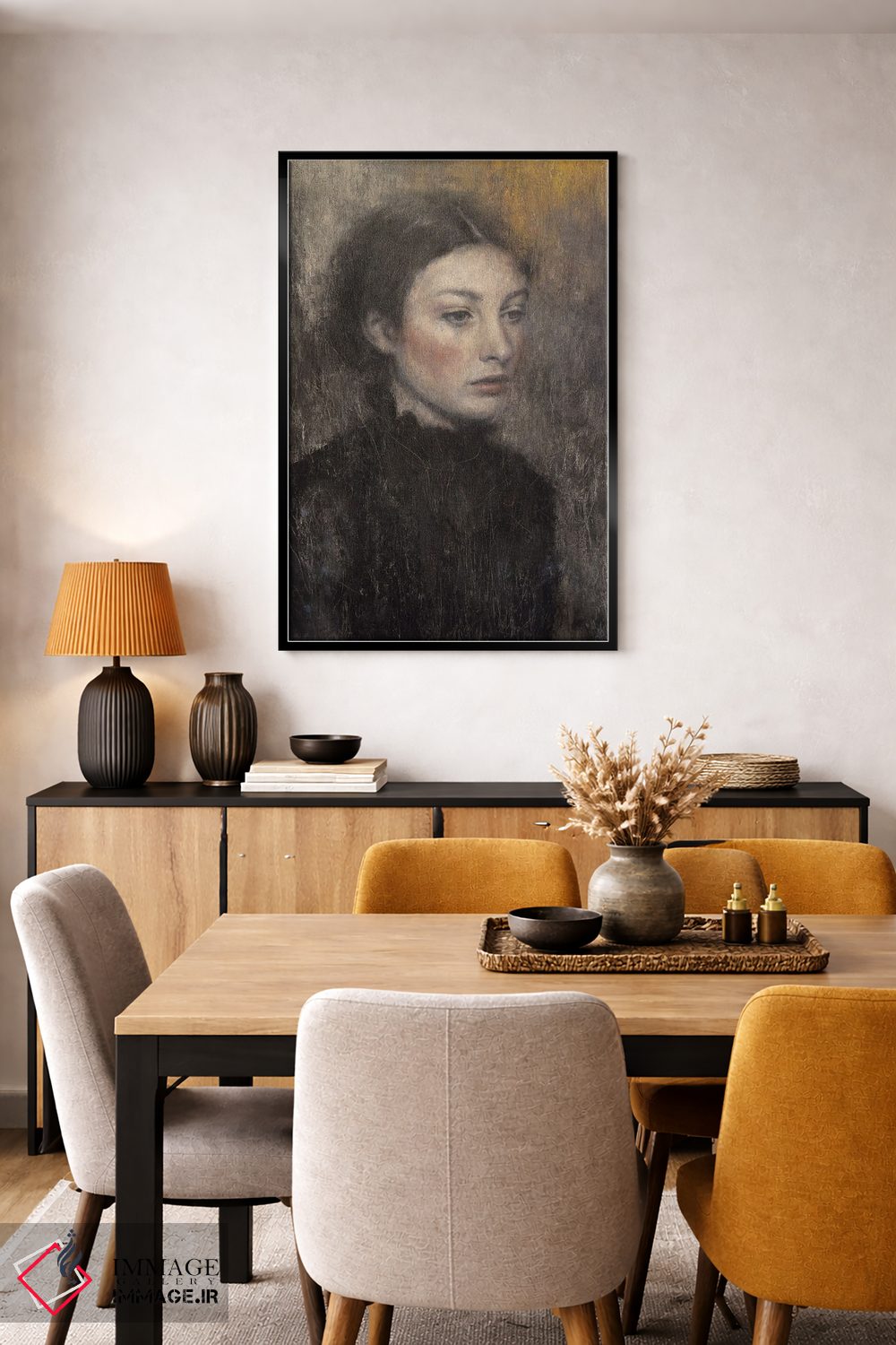 براساس پالت گرم اثر، قاب بلوط روشن (چوبی) پیشنهاد اول است و استخوانی ملایم مکمل. برای سفارشهای پروژهای با ابعاد و قابهای اختصاصی با ایماژ در تماس باشید.