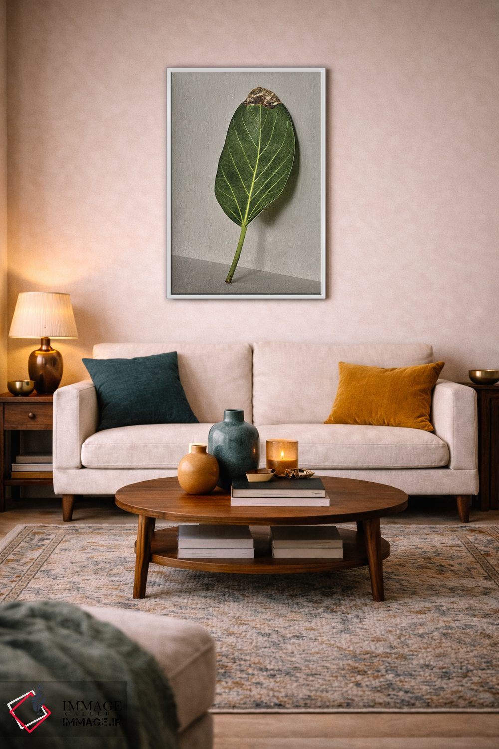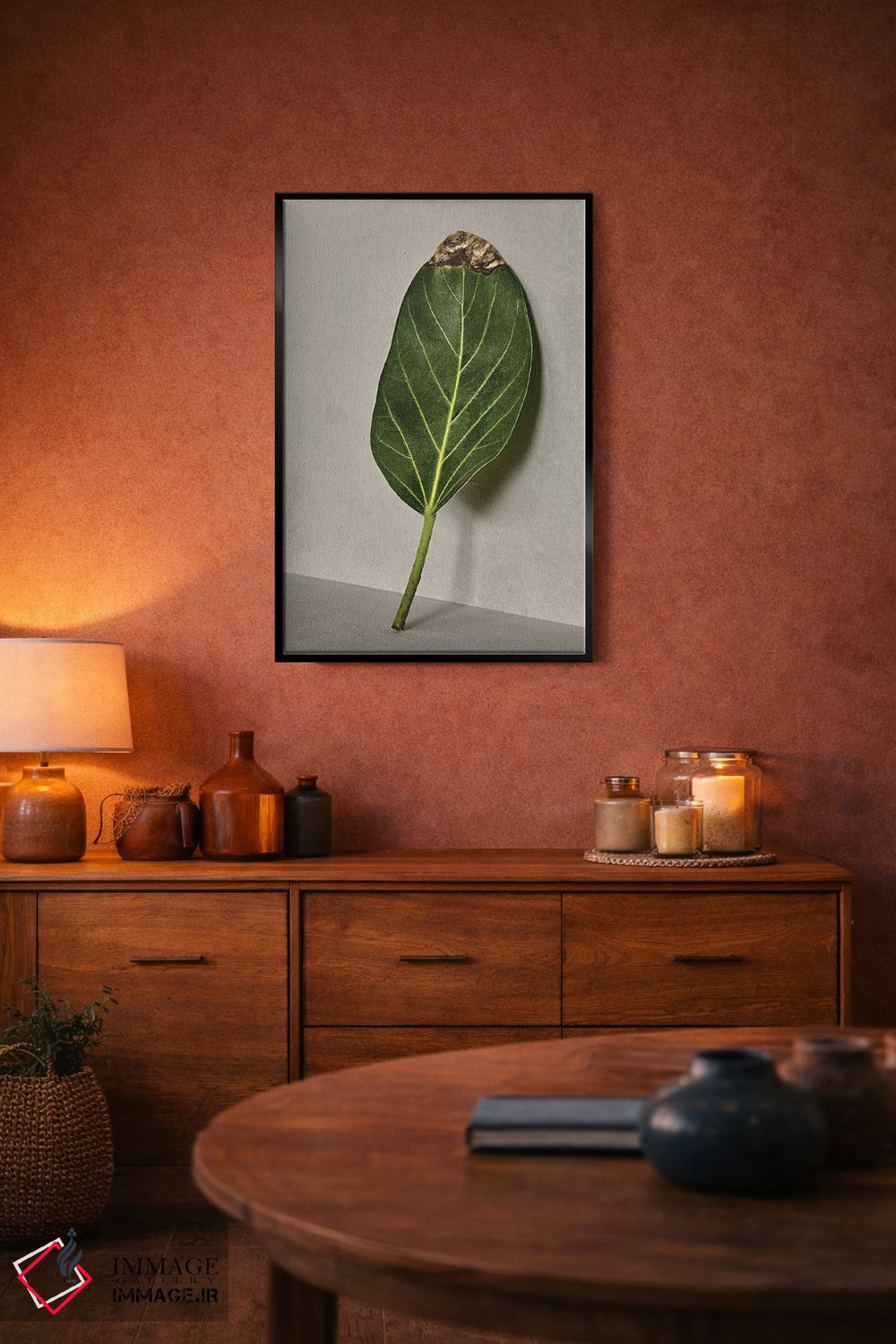 براساس پالت ترکیبی اثر، قاب تیک گرم (چوبی) پیشنهاد اول است و مشکی مات (فریم متوسط) مکمل. برای سفارشهای پروژهای با ابعاد و قابهای اختصاصی با ایماژ در تماس باشید.