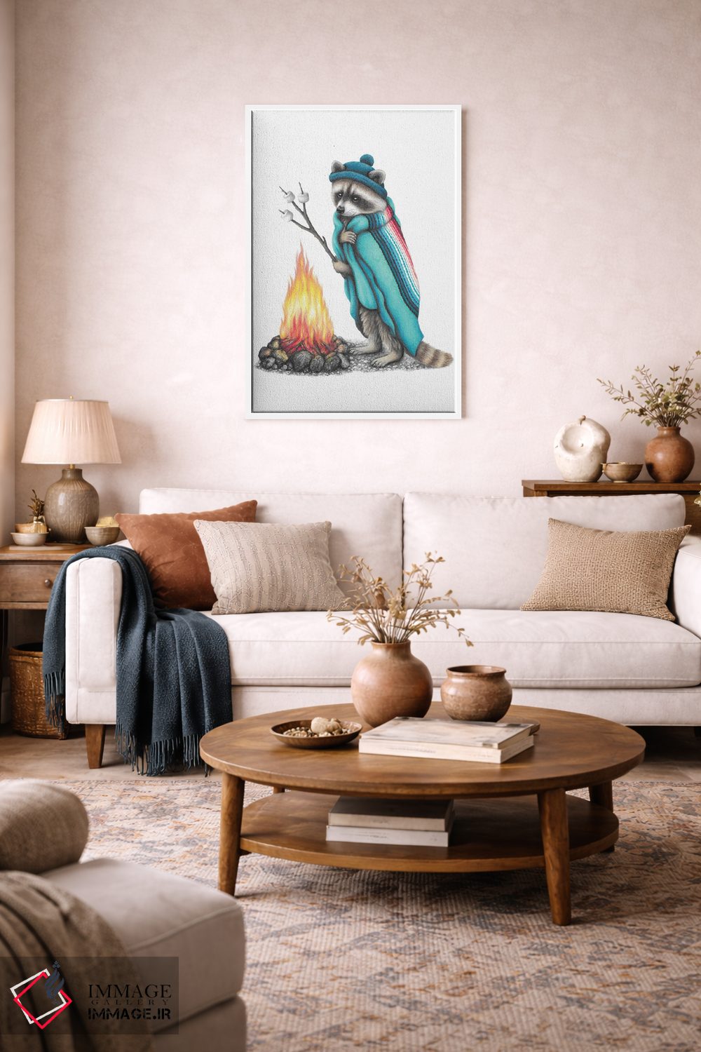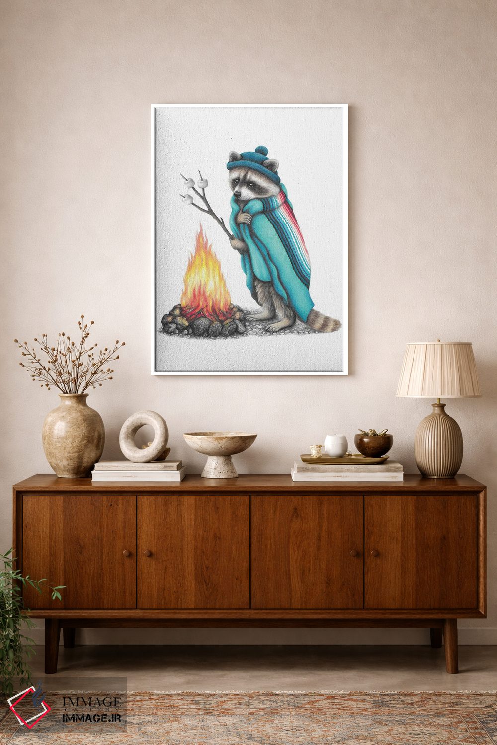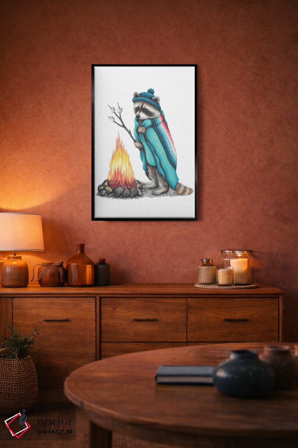 اگر فضای شما چوبی و گرم است، «راکون و آتش کمپ» اثرِ «مندی هک» با موضوعِ این اثر در لحن کلبه و لژ عالی مینشیند.