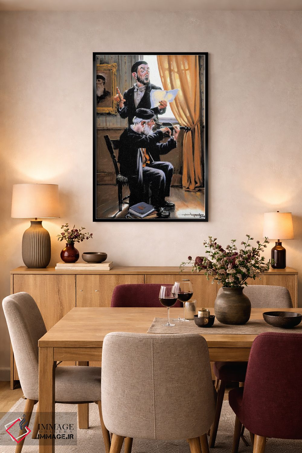 براساس پالت گرم اثر، قاب بلوط روشن (چوبی) پیشنهاد اول است و استخوانی ملایم مکمل. برای سفارشهای پروژهای با ابعاد و قابهای اختصاصی با ایماژ در تماس باشید.