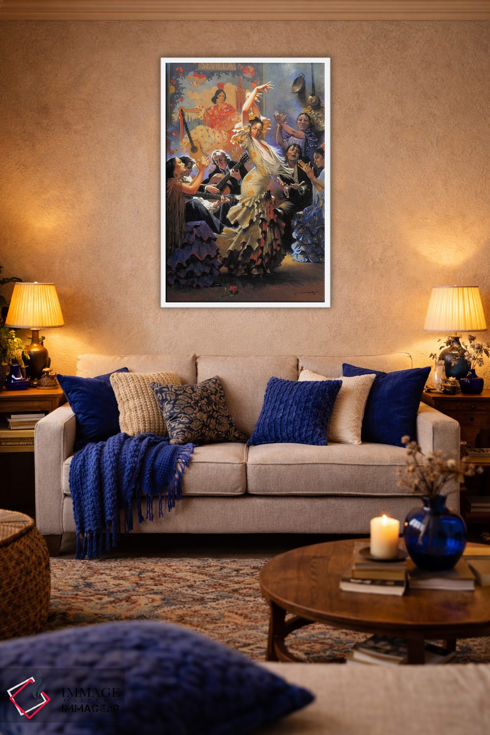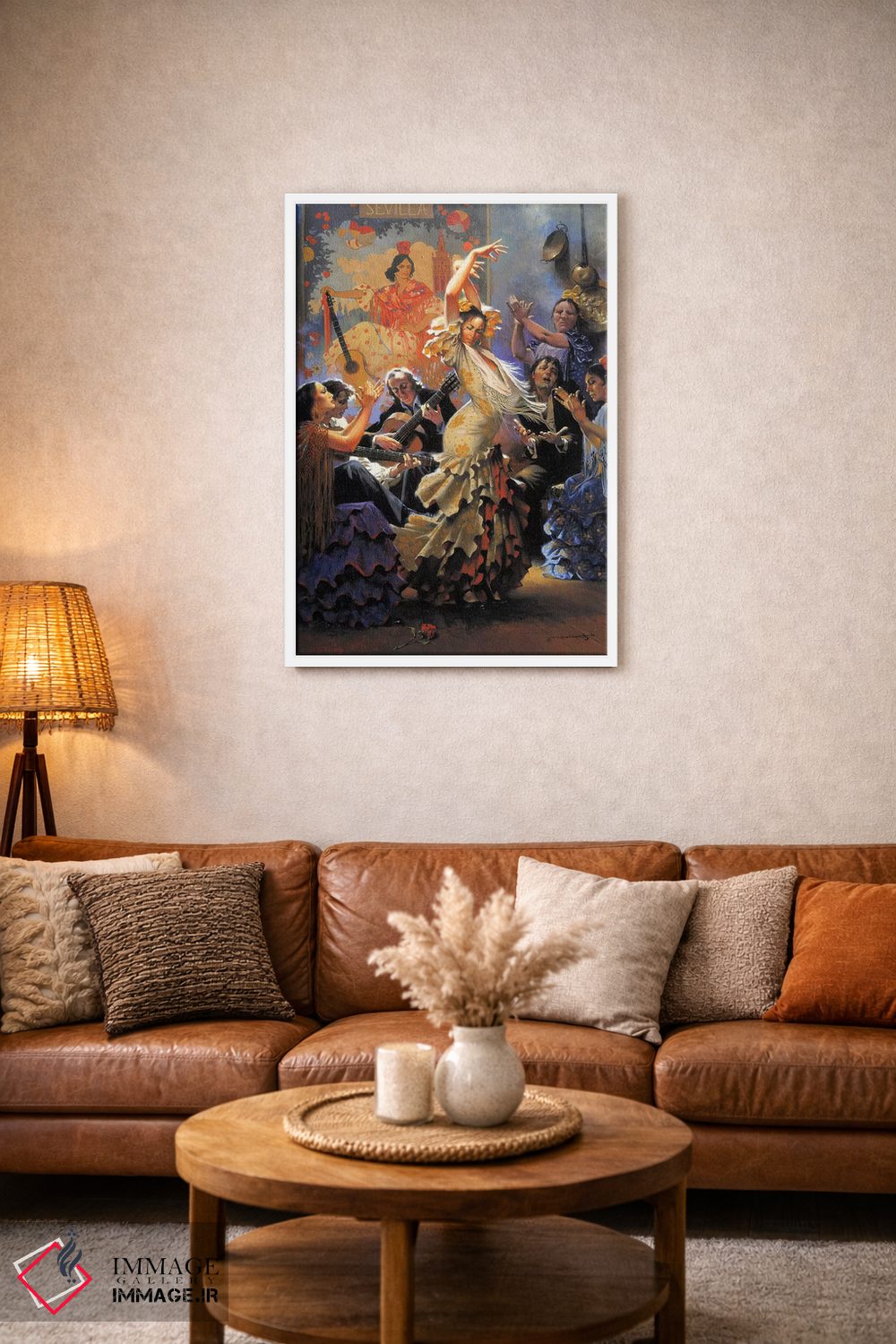 برای نشیمنهای روشن و دیوارهای سفید/طوسی، «وقتی میگریند، میخوانند و میرقصند» اثرِ «ماهر مرکوس» با موضوعِ این اثر انتخابی تمیز و چشمنواز است.
