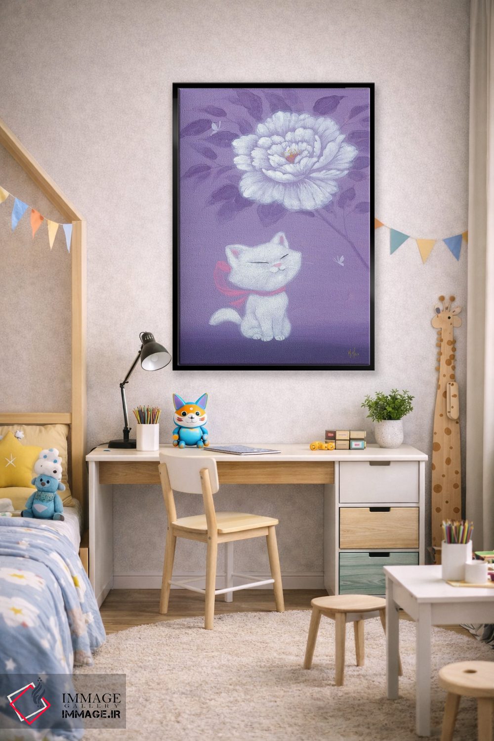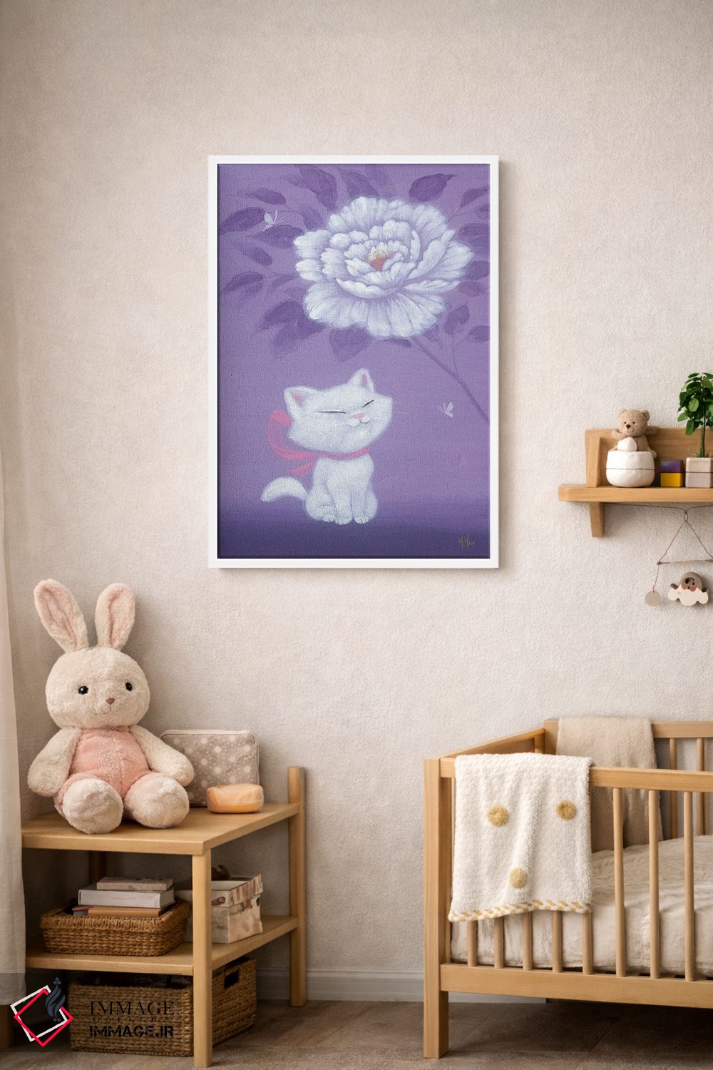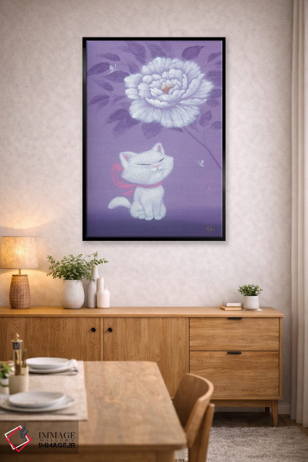 تابلو دکوراتیو گربه سفید و گل صدتومانی اثر مارتین هسو