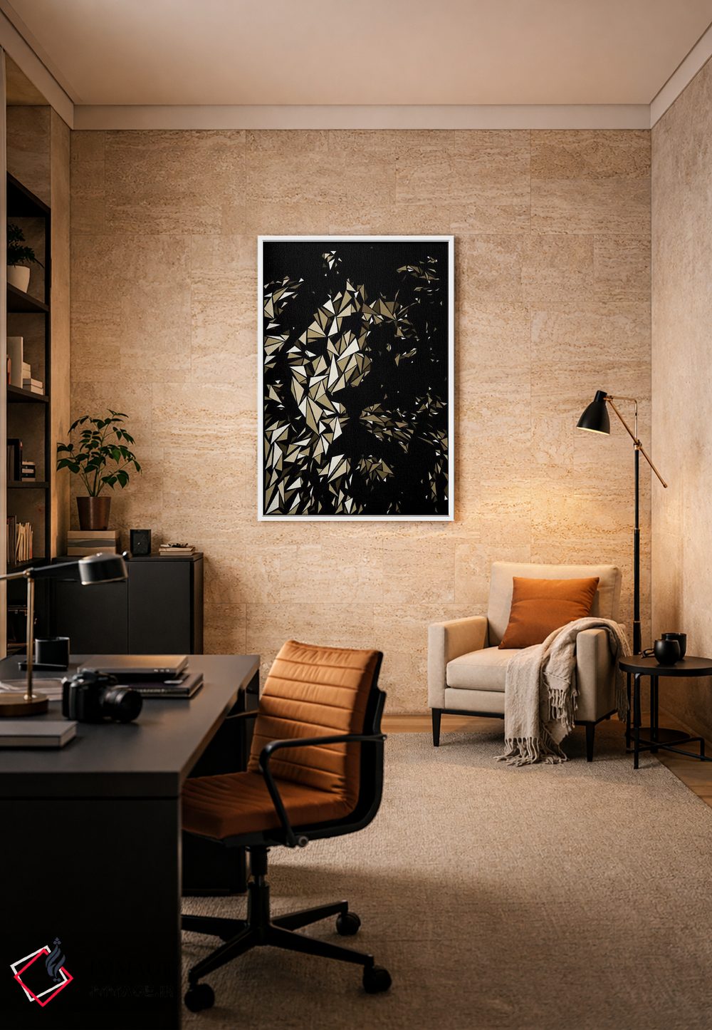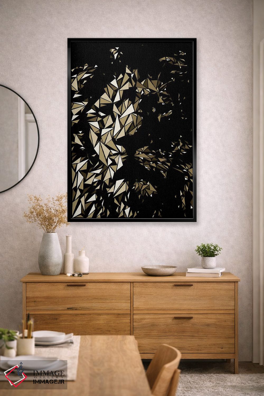 براساس پالت گرم اثر، قاب بلوط روشن (چوبی) پیشنهاد اول است و استخوانی ملایم مکمل. برای سفارشهای پروژهای با ابعاد و قابهای اختصاصی با ایماژ در تماس باشید.
