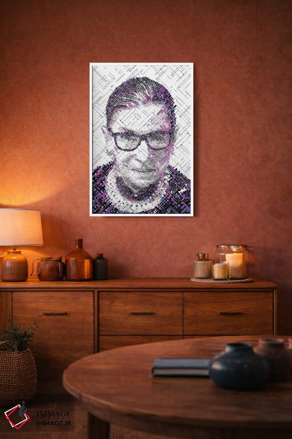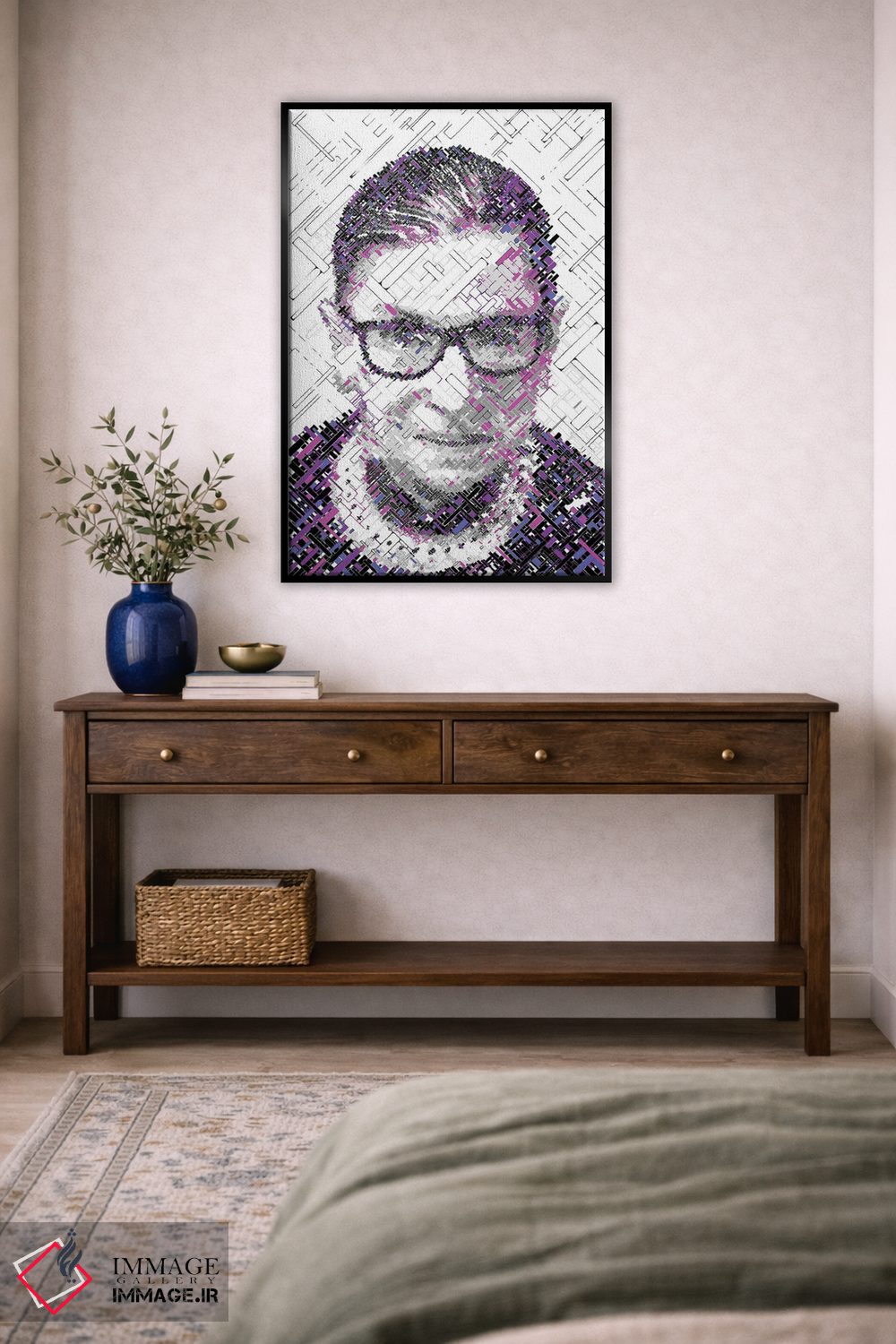 در «آر.بی.جی (مخفف روبین گینزبورگ)» اثرِ «کریستین میلئو»، توجه به جزئیاتِ گرافیکی و تعادل رنگی دیده میشود؛ مناسب برای دیوار شاخص.