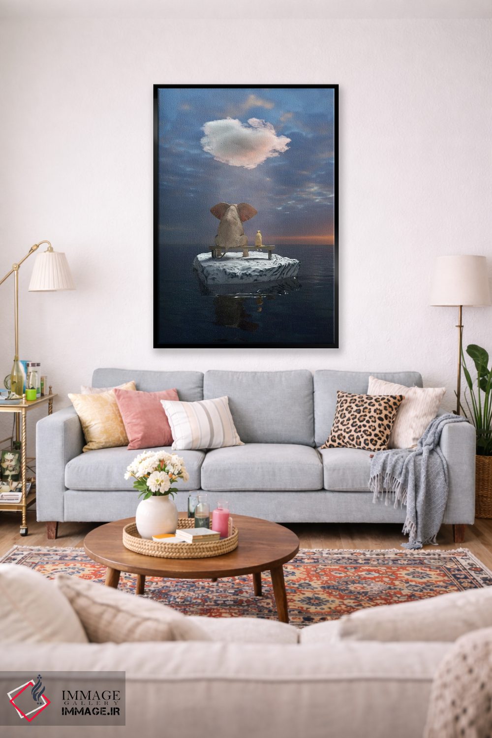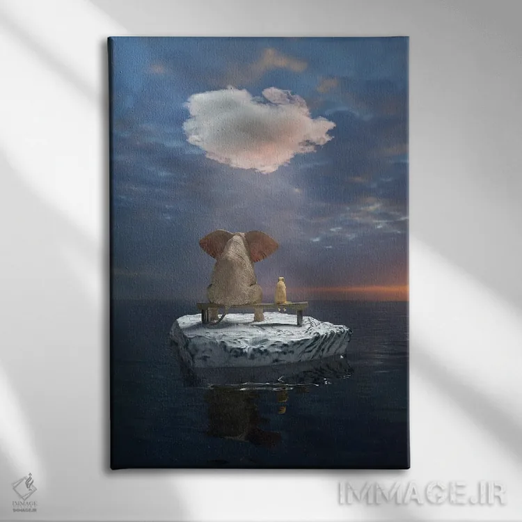 تابلو دکوراتیو یک فیل و یک سگ روی تکه یخ در دریا سفر می کنند اثر مایک کیف