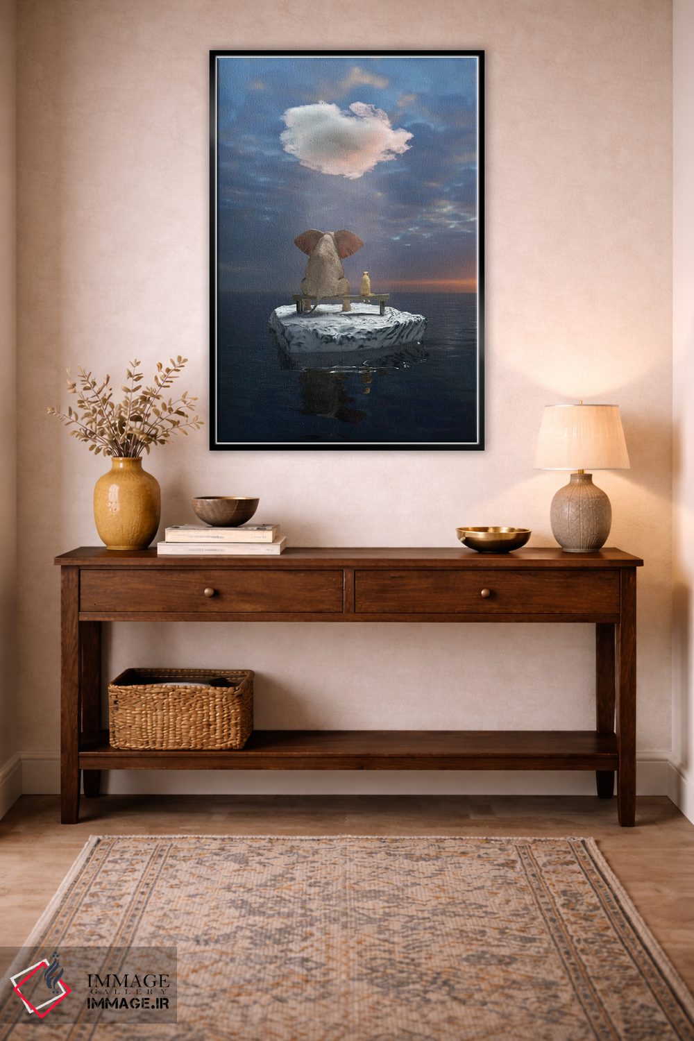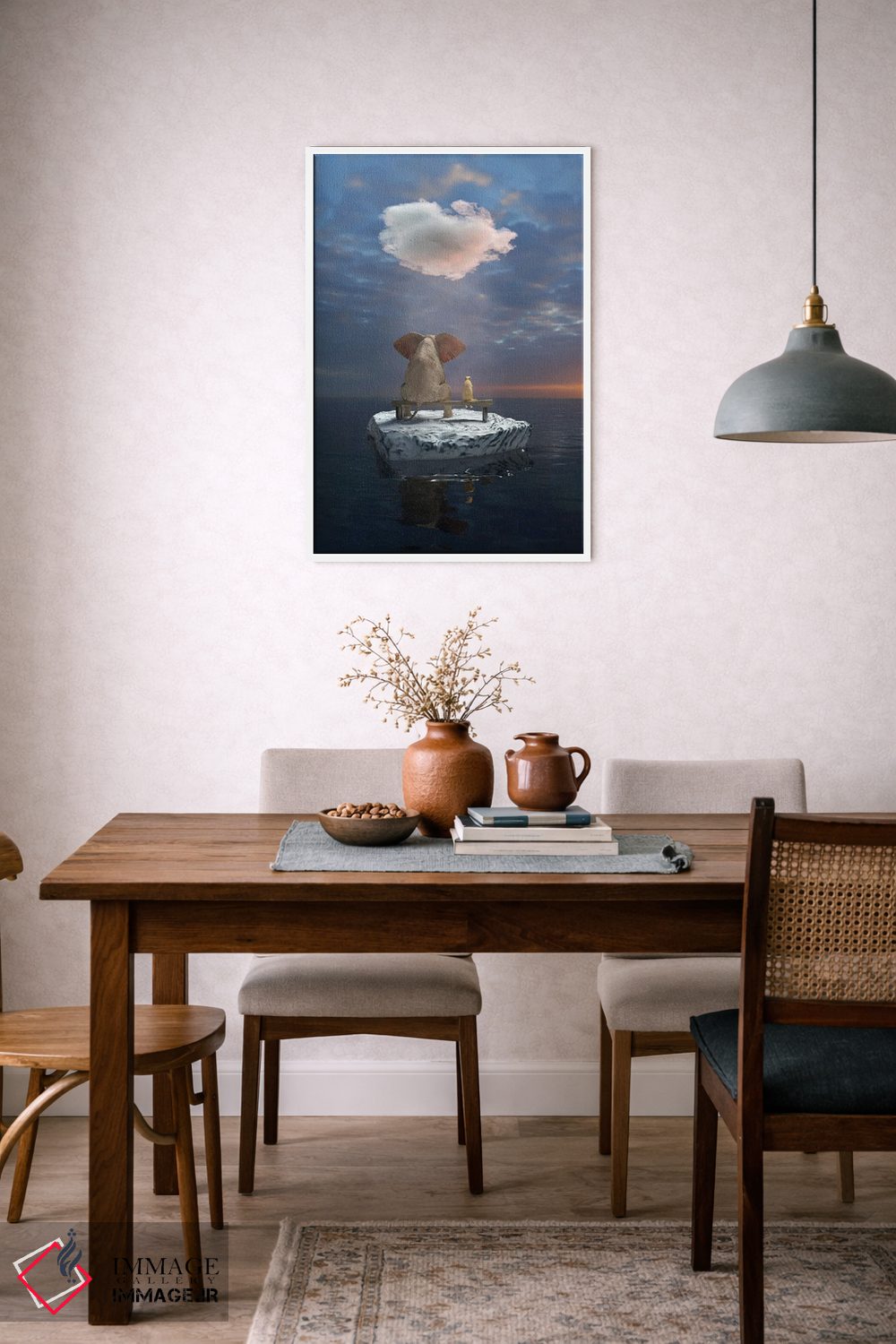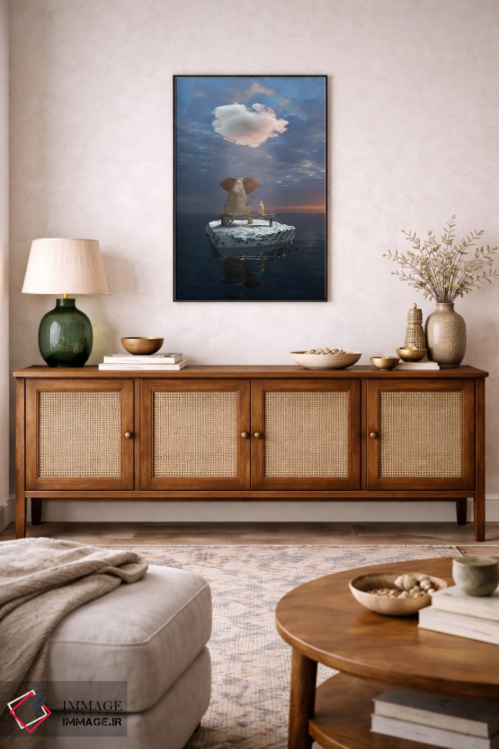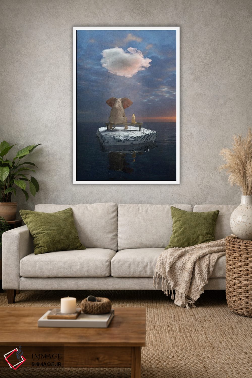 برای دکورهای صمیمی، «یک فیل و یک سگ روی تکه یخ در دریا سفر میکنند» اثرِ «مایک کیف» حس طبیعت را بیدغدغه وارد خانه میکند؛ برای دیوار کنار میز کار انتخابی خوشسلیقه است. هم فضا را گرم میکند، هم شلوغش نمیکند.