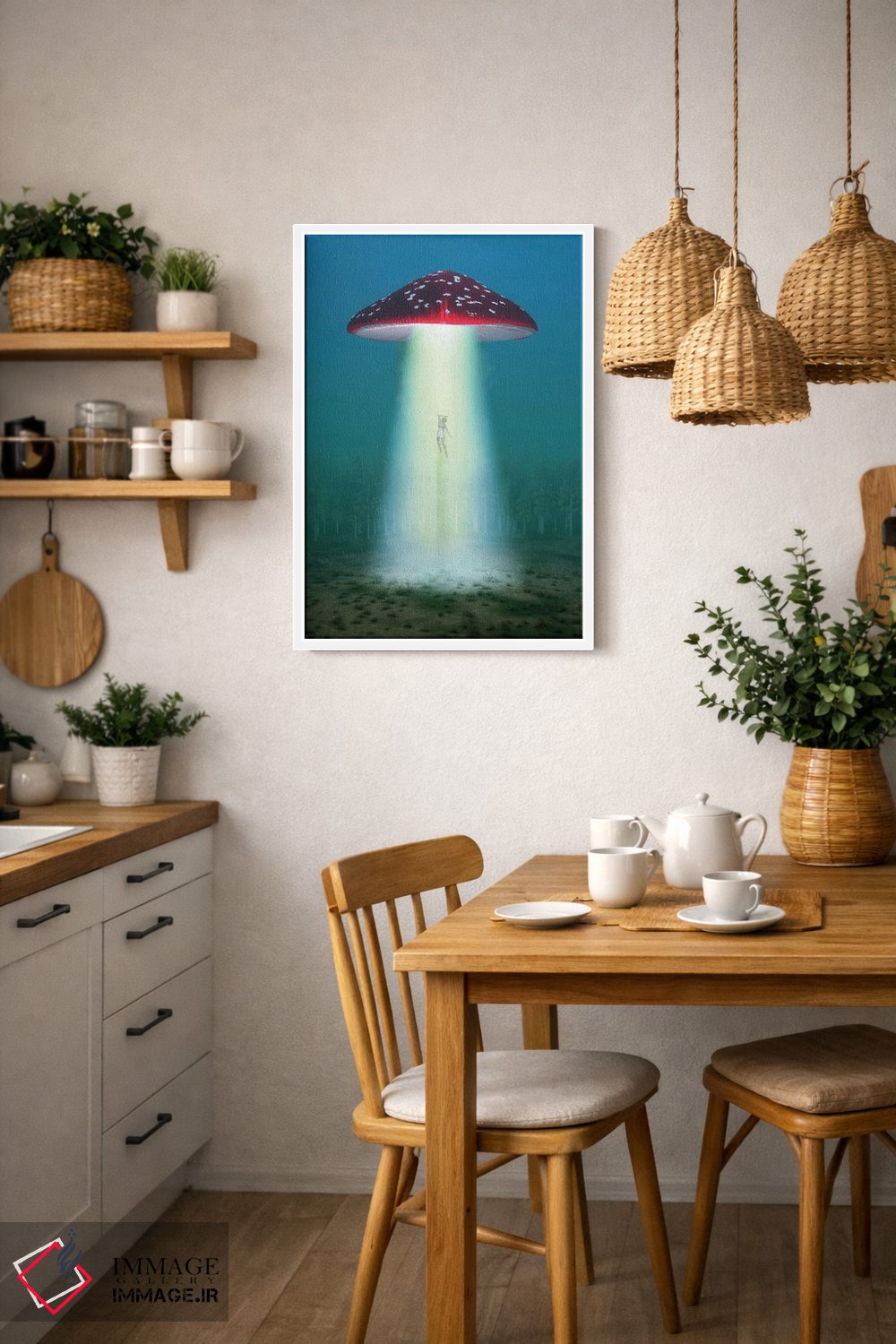 تابلو دکوراتیو قارچ توهم زا پرنده در شب زنی را می رباید اثر مایک کیف - نمای روبه‌رو روی دیوار