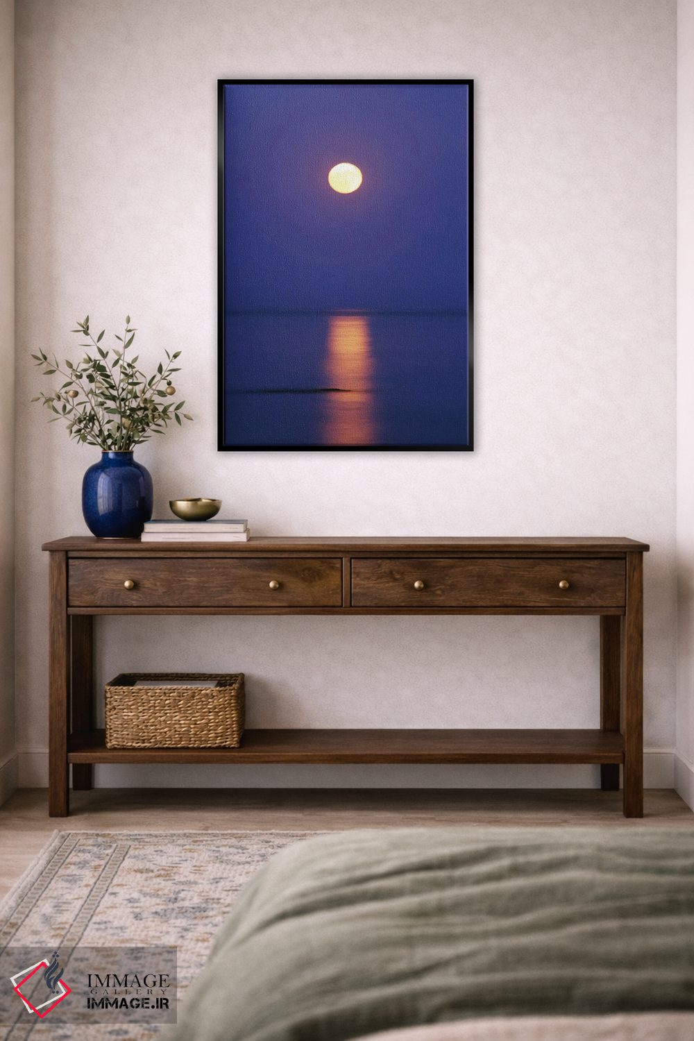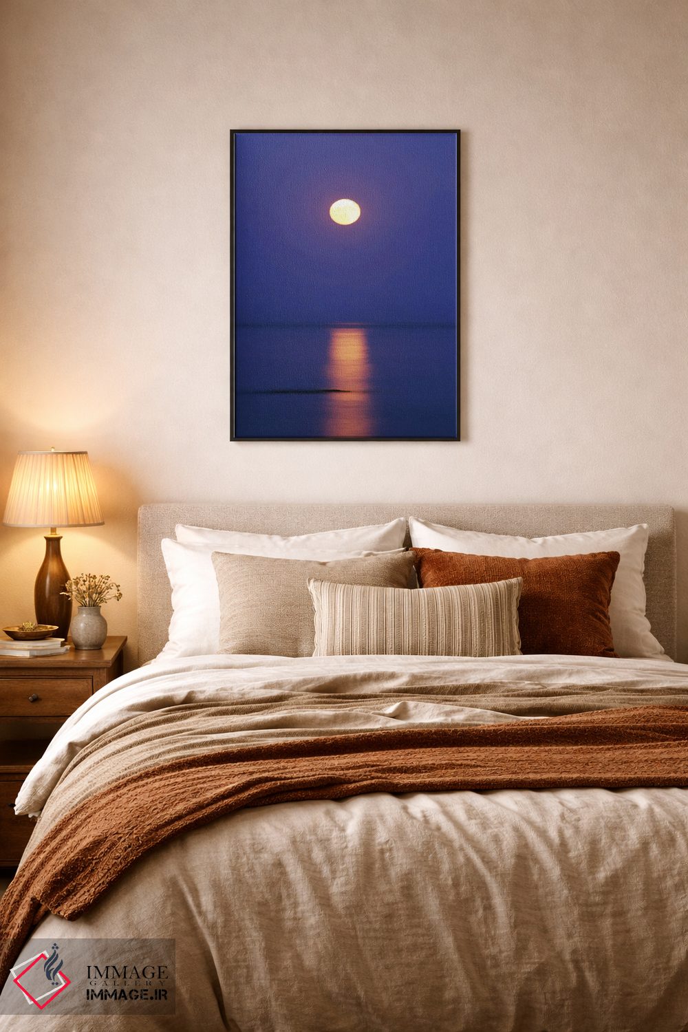 «ماه کامل بالای دریا» اثرِ «مایک کیف» از آن انتخابهاییست که جلوهٔ اتاق را یک پله حرفهایتر میکند؛ برای دکورهای کلاسیک با چوب و پارچه انتخابی عالی است. اگر دنبال زیباییِ بیادعا هستید، این اثر درست مینشیند.