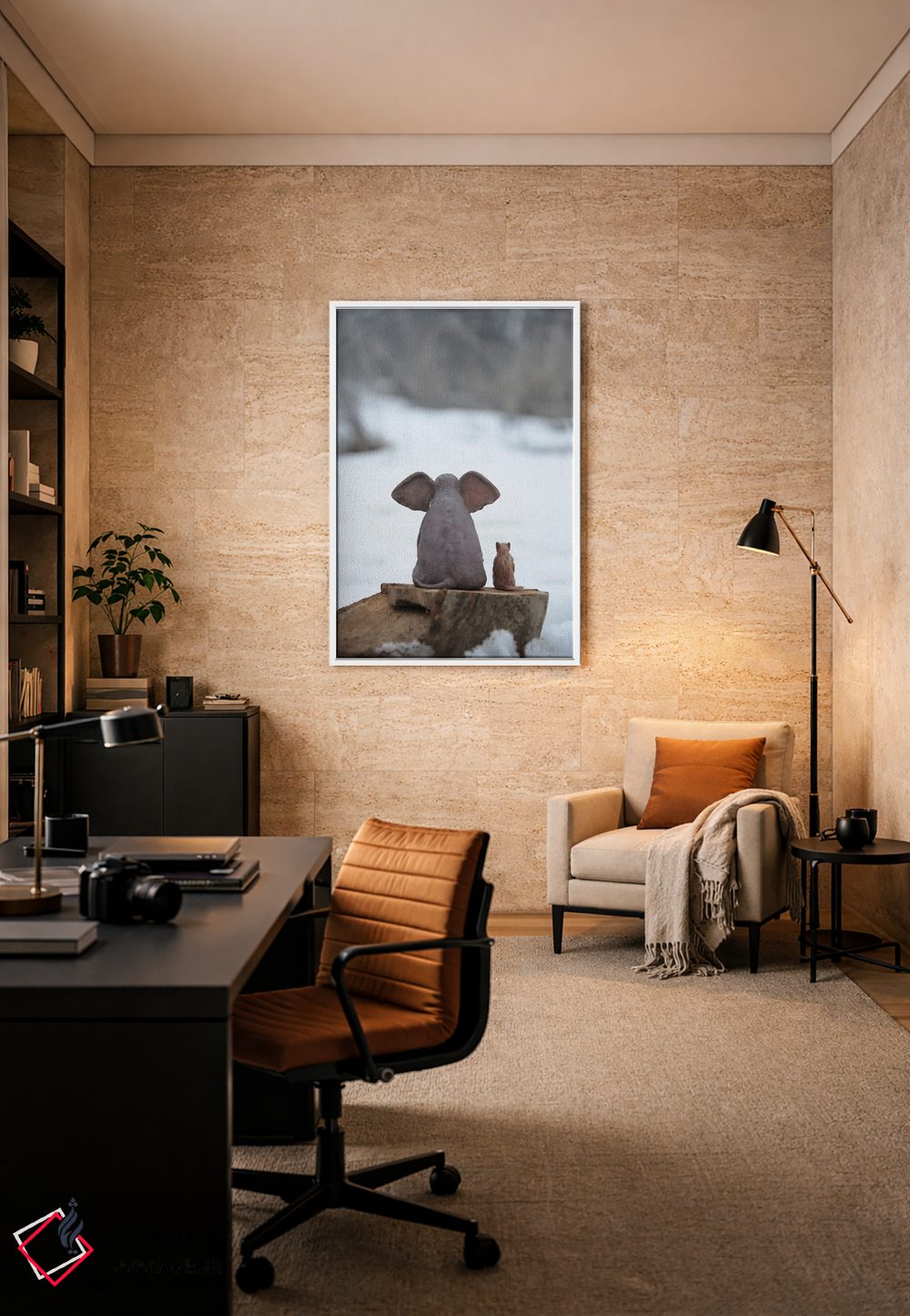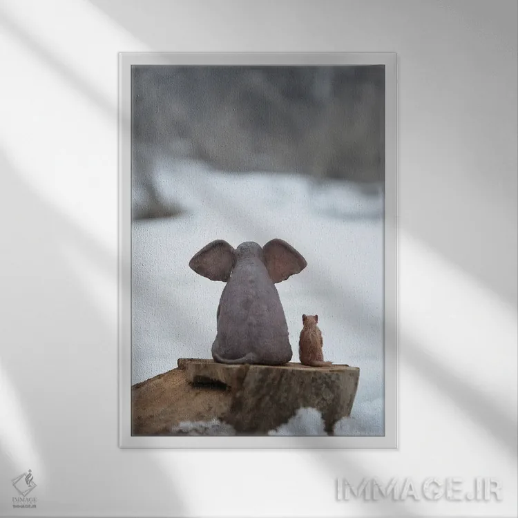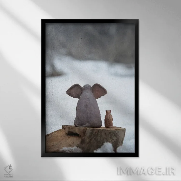 اگر میخواهید دیوار کمی سرزندگیِ محترمانه داشته باشد، «فیل و سگ روی تنه درخت در زمستان نشستهاند» اثرِ «مایک کیف» حس طبیعت را بیدغدغه وارد خانه میکند، برای اتاق کودک (بدون لحن کودکانه) گزینهٔ مناسبیست. با قاب چوبی یا مشکی، حس مرتبتری پیدا میکند.