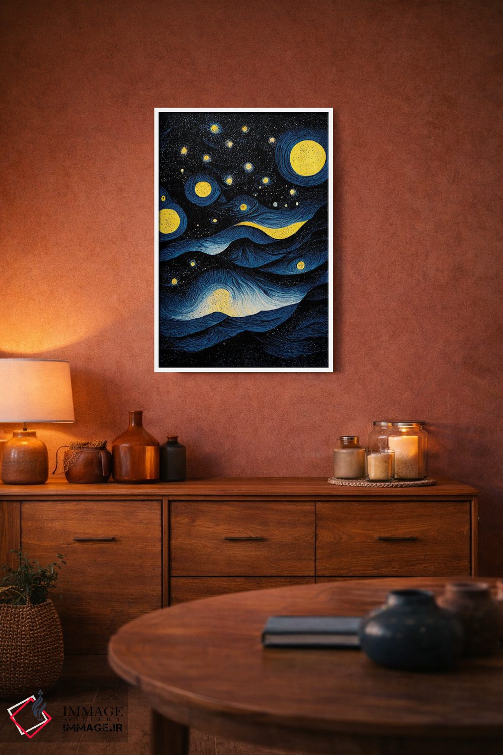 براساس پالت ترکیبی اثر، قاب تیک گرم (چوبی) پیشنهاد اول است و مشکی مات (فریم متوسط) مکمل. برای سفارشهای پروژهای با ابعاد و قابهای اختصاصی با ایماژ در تماس باشید.