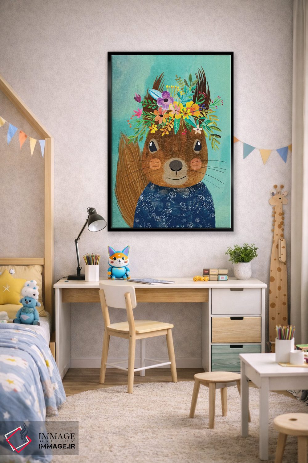 «سنجاب» اثرِ «میا چارّو» میتواند فضا را صمیمیتر و دعوتکنندهتر نشان بدهد؛ برای اتاق بازی یا گوشهٔ مطالعه پیشنهاد میشود. هم فضا را گرم میکند، هم شلوغش نمیکند.