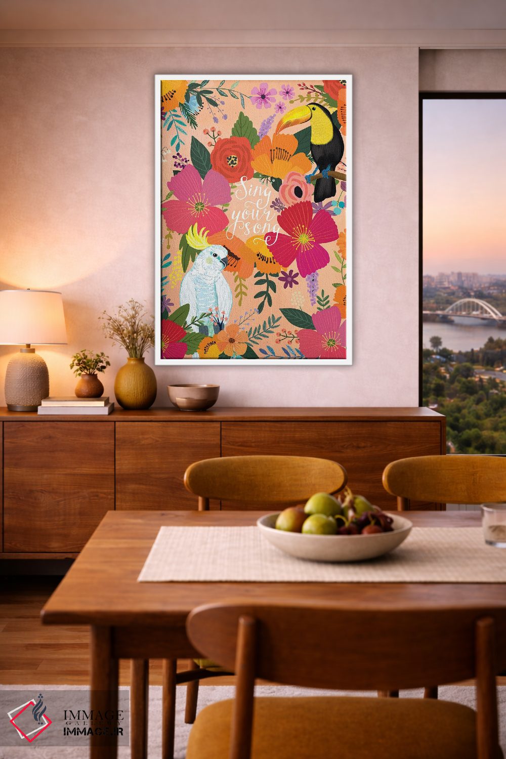 طراحی بوم گالری ایماژ بهگونهای است که اثر روی دیوار «پرداختشده» و حرفهای دیده شود—نه پرزرقوبرقِ بیپایه؛ بلکه دقیق و خوشپرداخت. بافت ظریف کنواس کمک میکند حس اثر هنری را در نگاه نزدیک نگه میدارد و همان «پرداخت» تفاوت را میسازد. بافت ظریف کنواس کمک میکند به تصویر شخصیت میدهد بدون اینکه شلوغ کند. حاصل کار، یک تابلو خوشنشین است که هم از دور اثرگذار است و هم از نزدیک خوشخوان؛ و اگر بخواهید، میتوان چیدمان را برای گالریوال هم پیشنهاد داد.