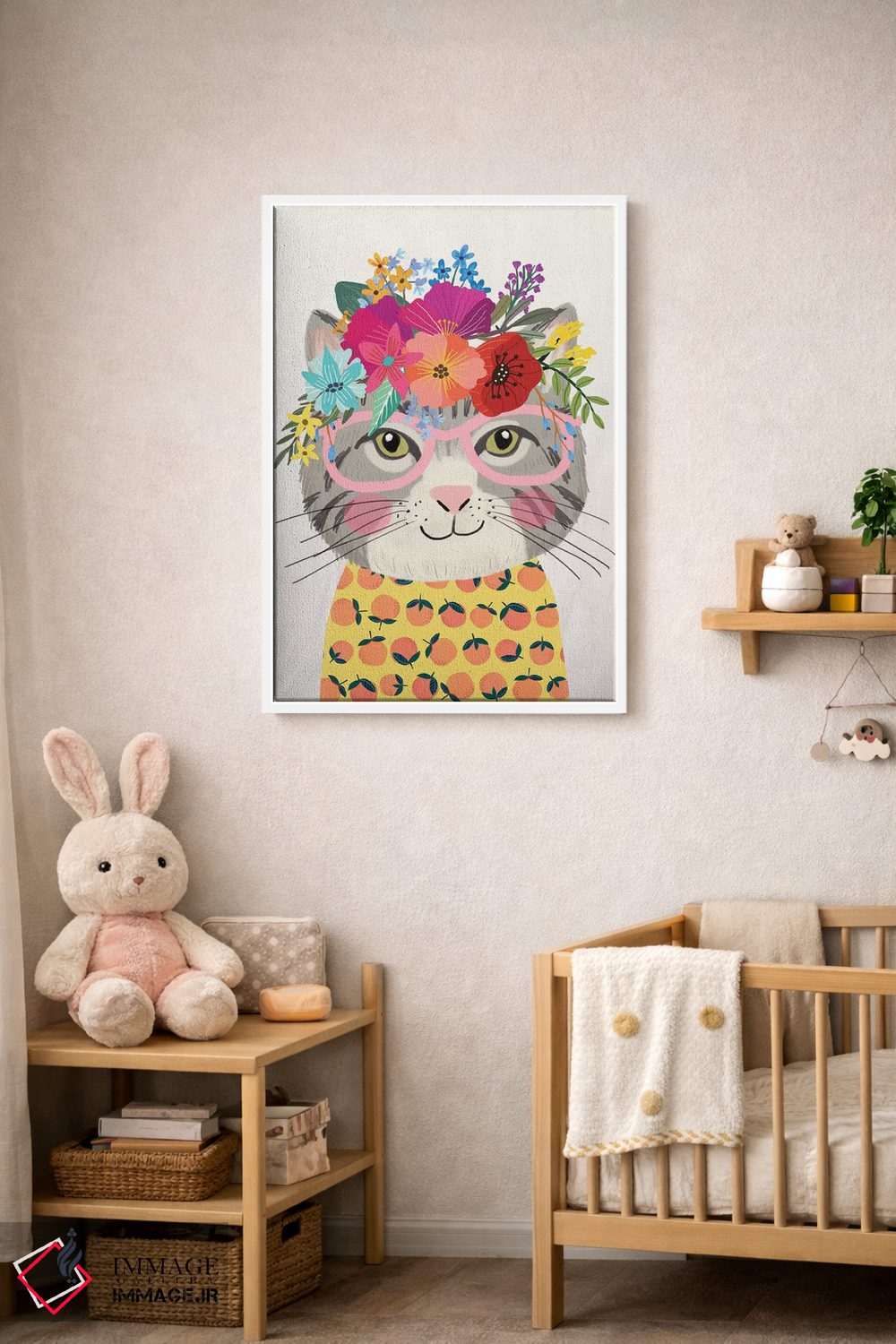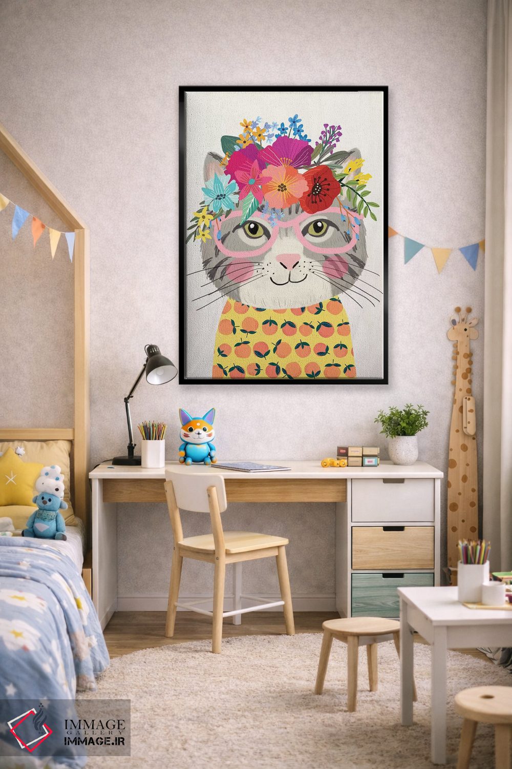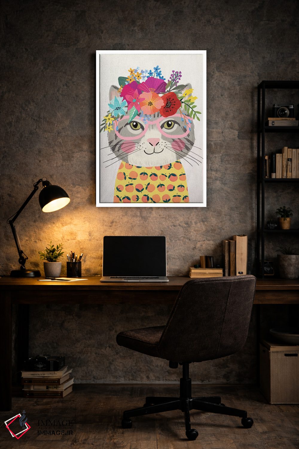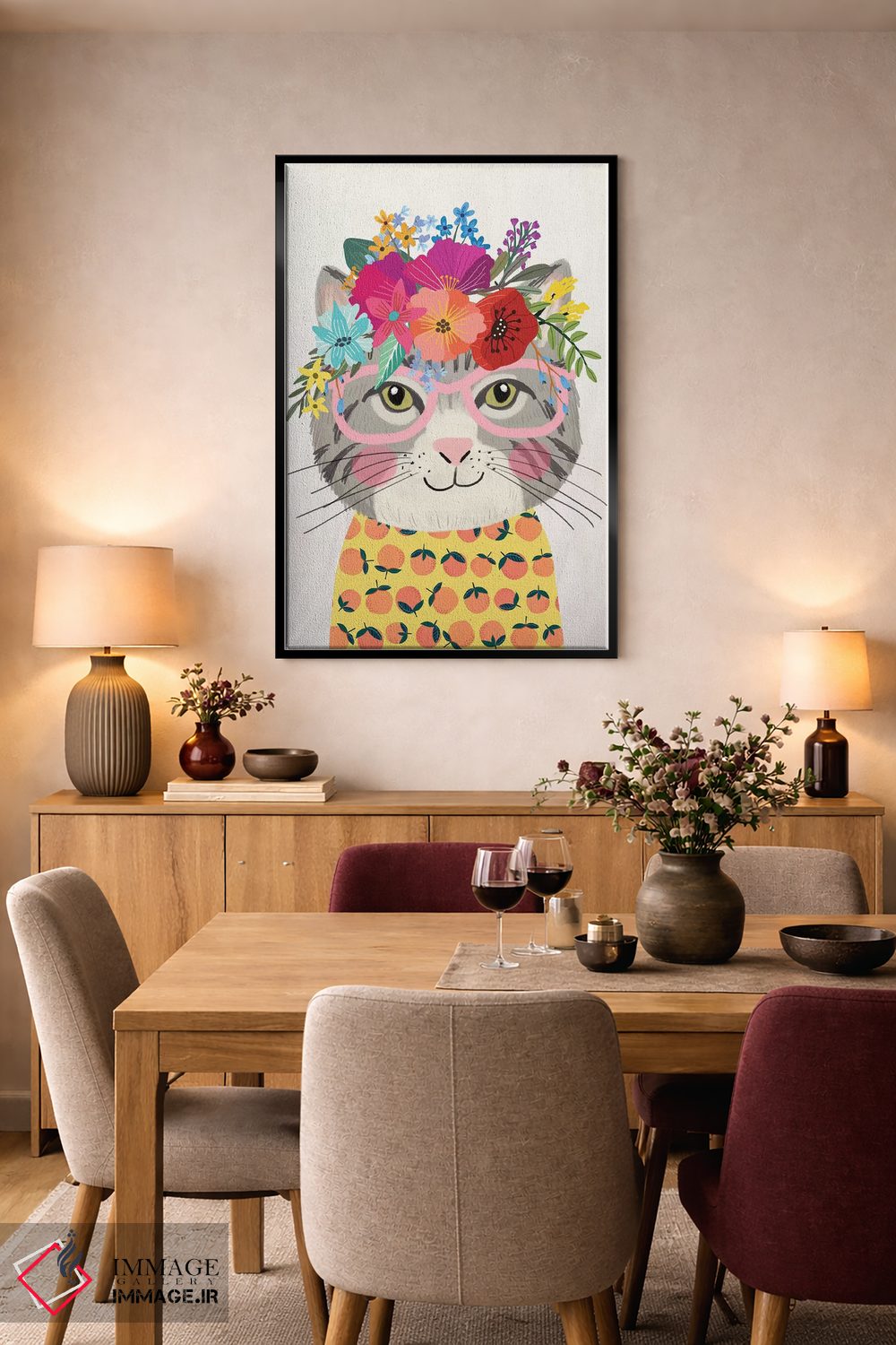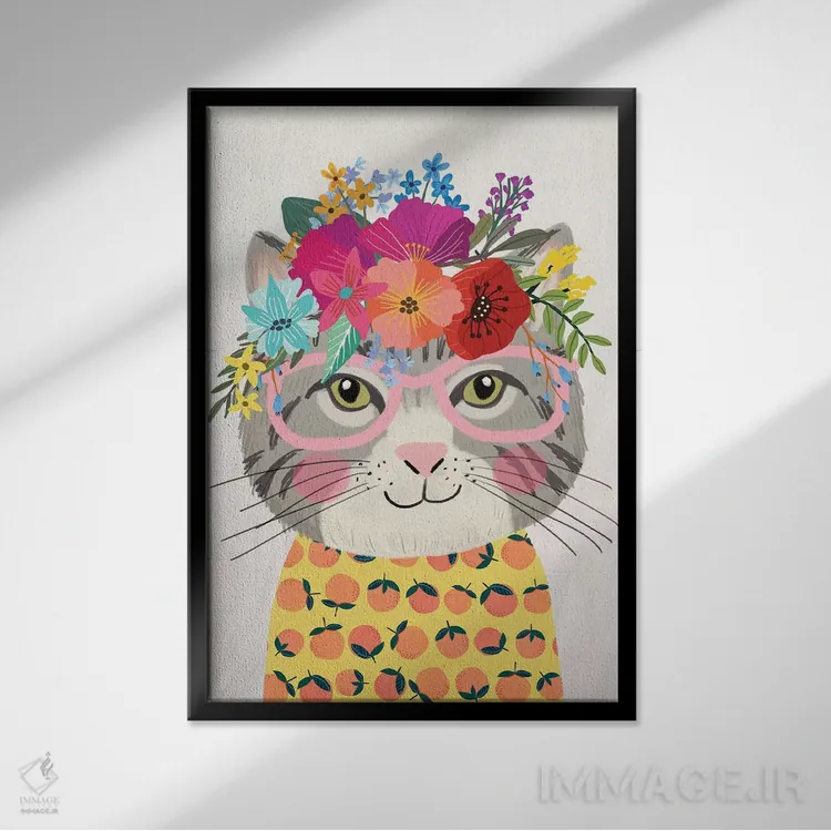 «گربهٔ خاکستری ۲» اثرِ «میا چارّو» میتواند فضا را صمیمیتر و دعوتکنندهتر نشان بدهد؛ برای خانههایی با چوب و پارچههای گرم پیشنهاد میشود. با قاب چوبی یا مشکی، حس مرتبتری پیدا میکند.