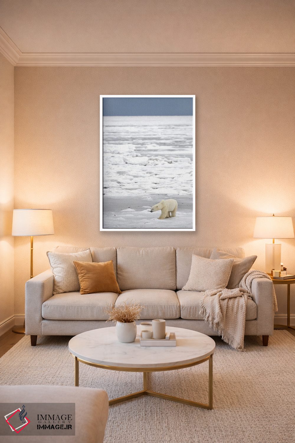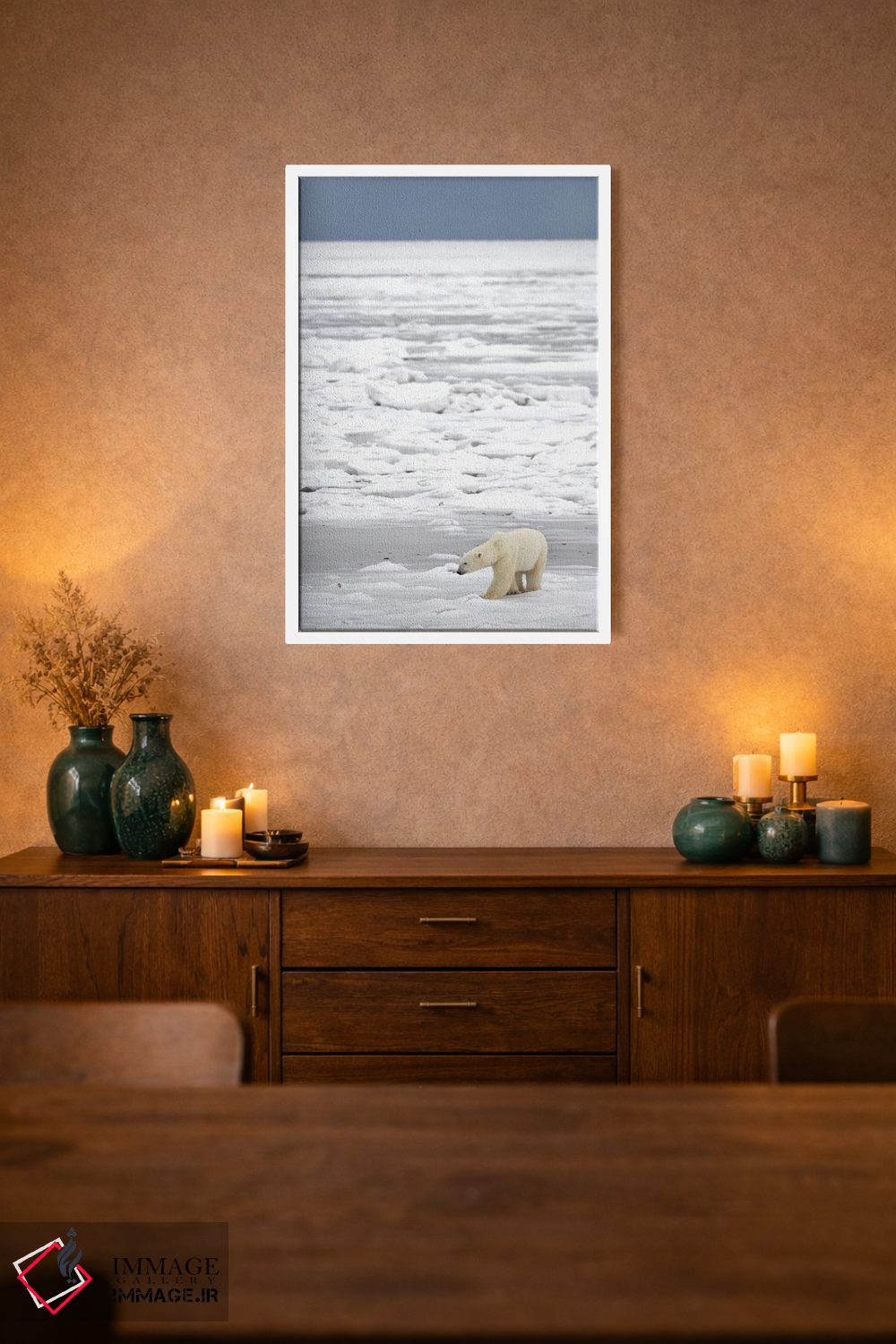 «خرسهای قطبی کانادا ۲۱» اثرِ «میگل لاسا» میتواند فضا را صمیمیتر و دعوتکنندهتر نشان بدهد؛ برای کافههای کوچک و صمیمی پیشنهاد میشود. به دیوار، قصه میدهد—اما قصهای آرام و شیک.