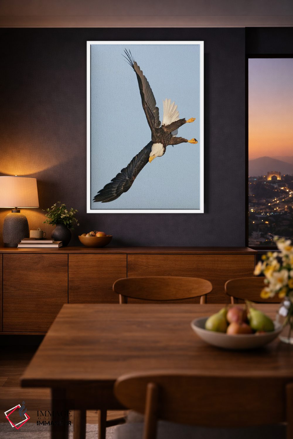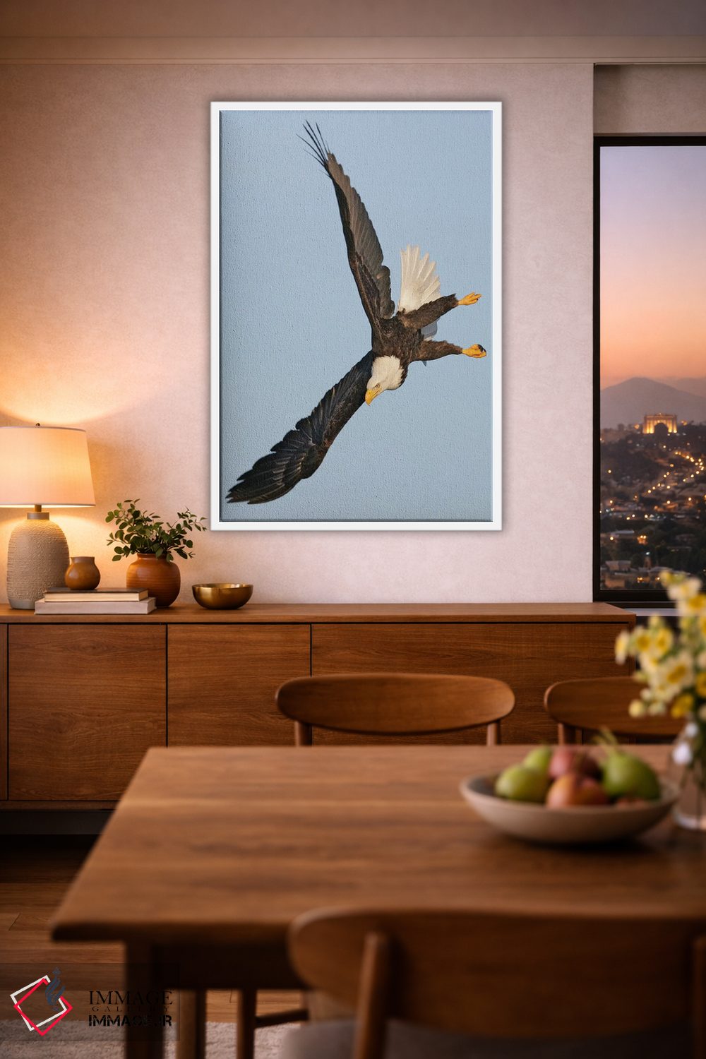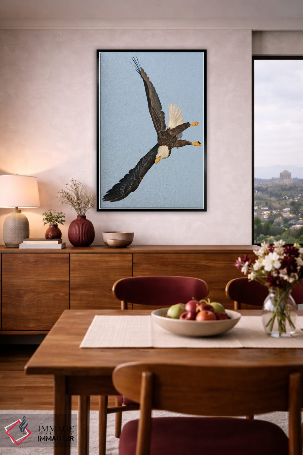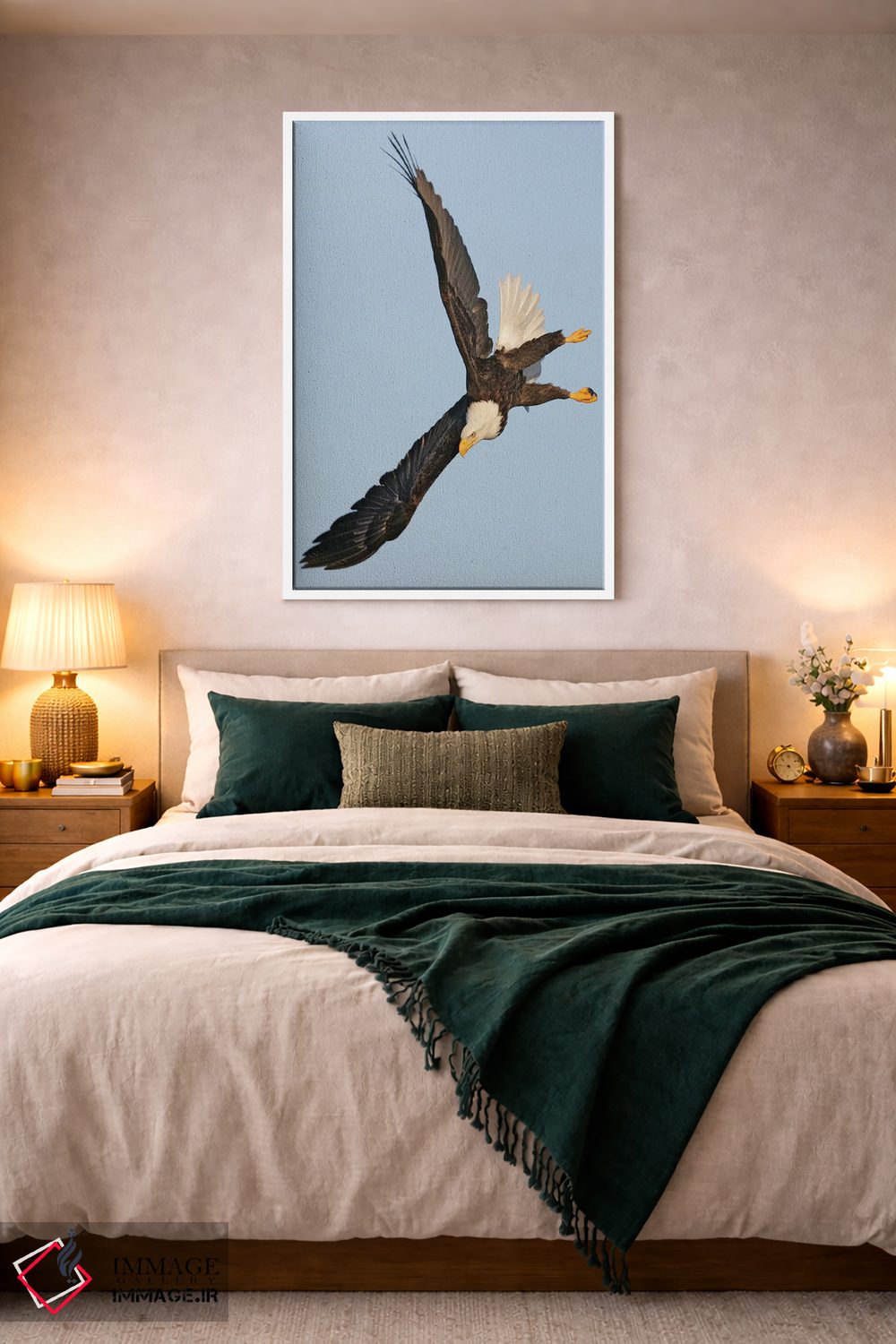 براساس پالت گرم اثر، قاب بلوط روشن (چوبی) پیشنهاد اول است و استخوانی ملایم مکمل. برای سفارشهای پروژهای با ابعاد و قابهای اختصاصی با ایماژ در تماس باشید.