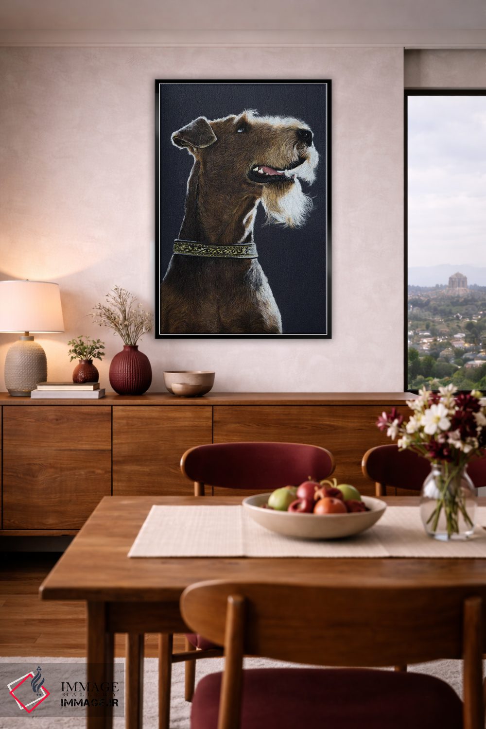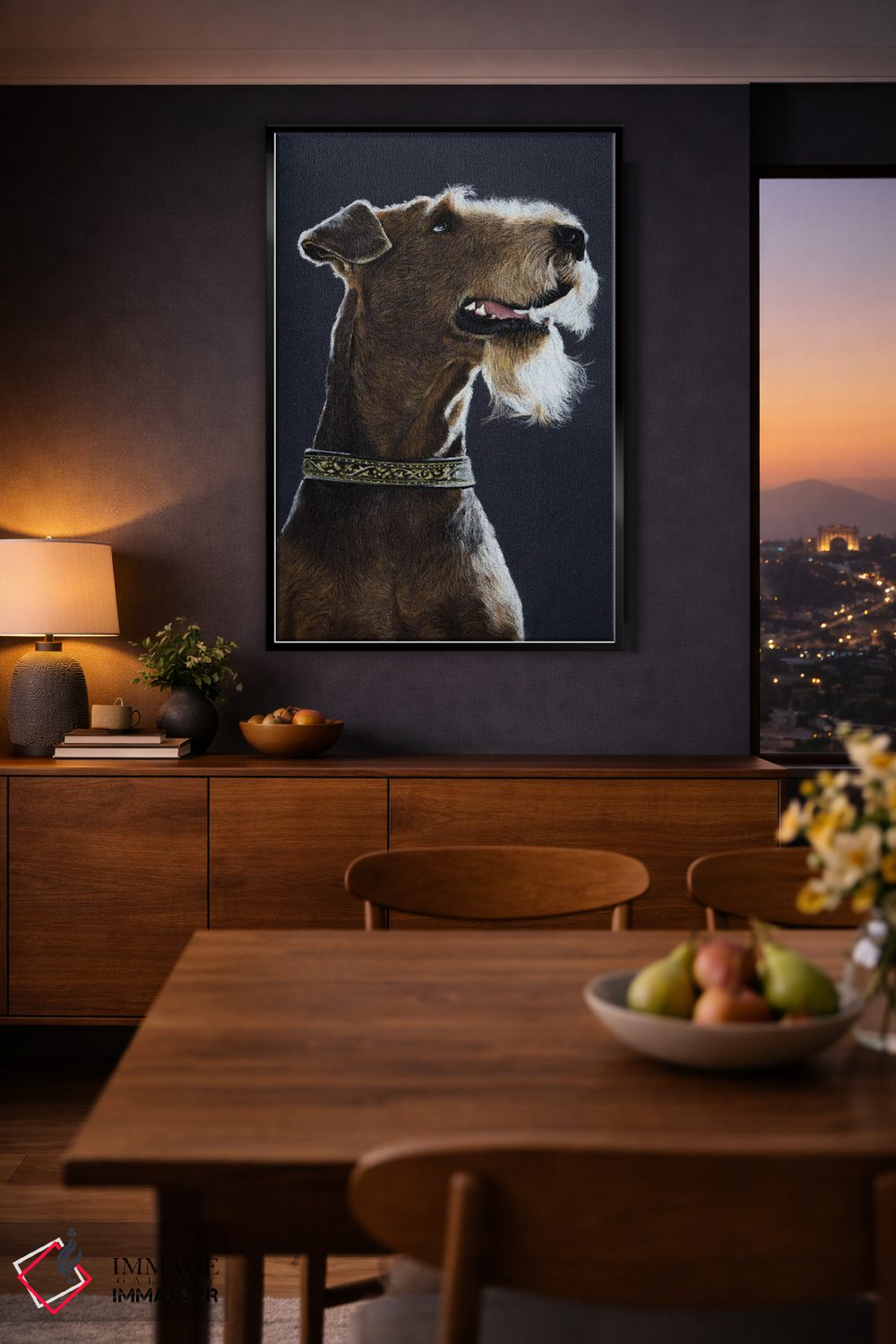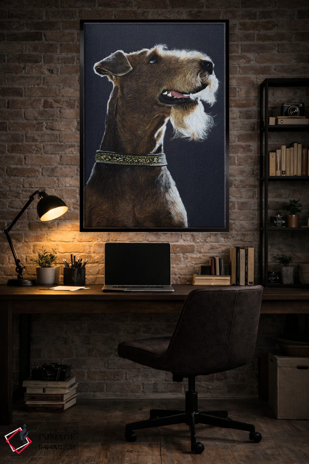 اگر میخواهید دیوار کمی سرزندگیِ محترمانه داشته باشد، «آیردِیل تریر (سگ آیردیل)» اثرِ «میخائیل ودرنیکوف» فضا را صمیمیتر و دعوتکنندهتر نشان میدهد، برای نشیمنهای خانوادگی گزینهٔ مناسبیست. با نورپردازی نقطهای، جذابتر هم میشود.