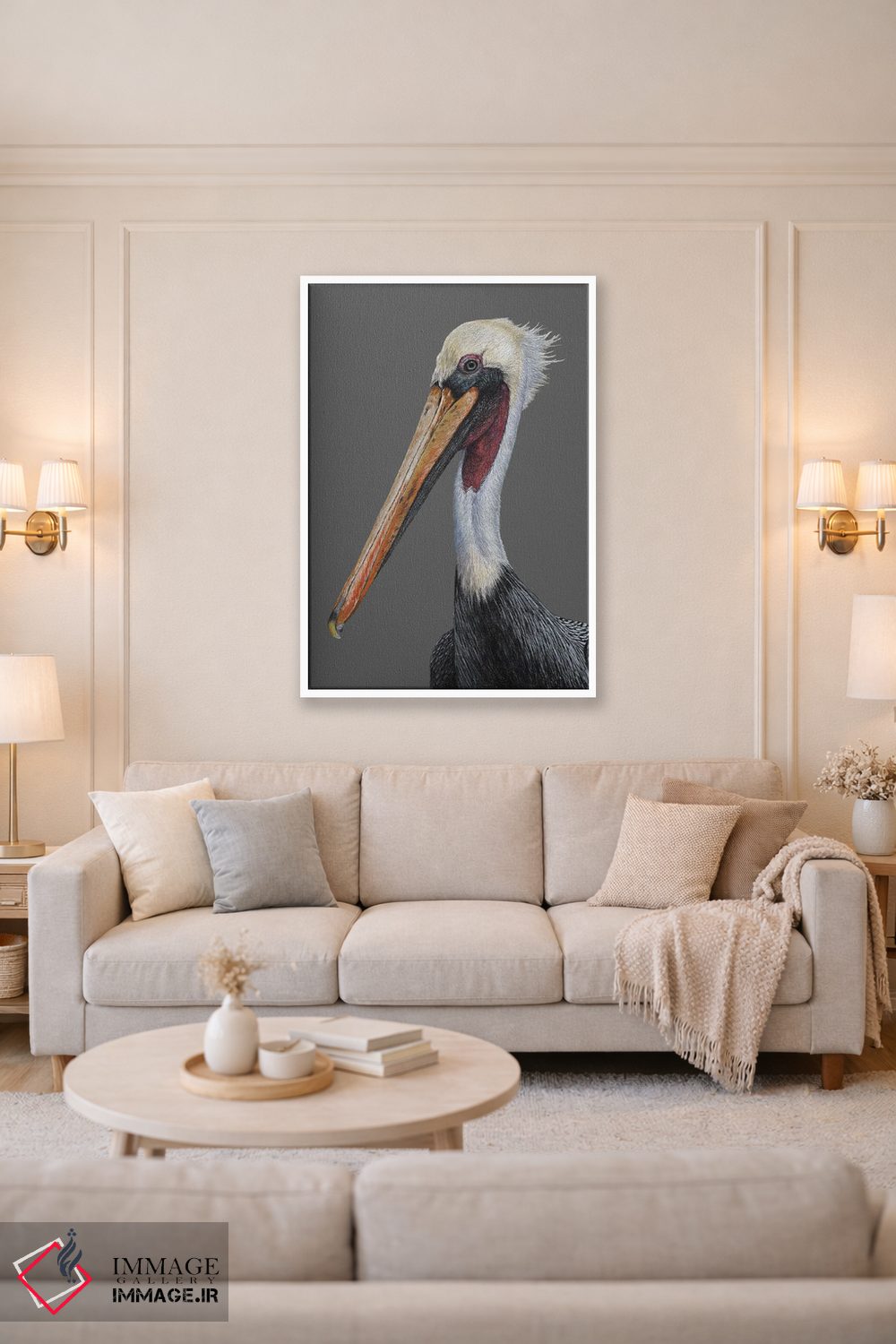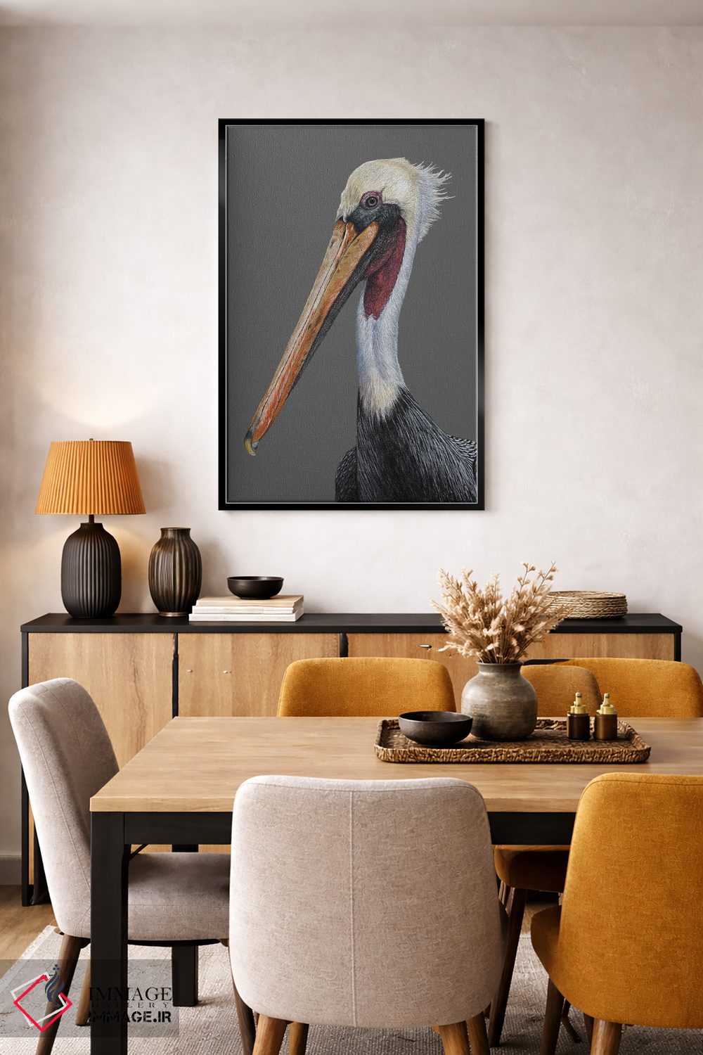 «پلیکان قهوهای» اثرِ «میخائیل ودرنیکوف» از آن کارهاییست که به دیوار، انرژیِ نرم و زنده میدهد؛ برای کافههای کوچک و صمیمی انتخاب خوبیست. هم فضا را گرم میکند، هم شلوغش نمیکند.