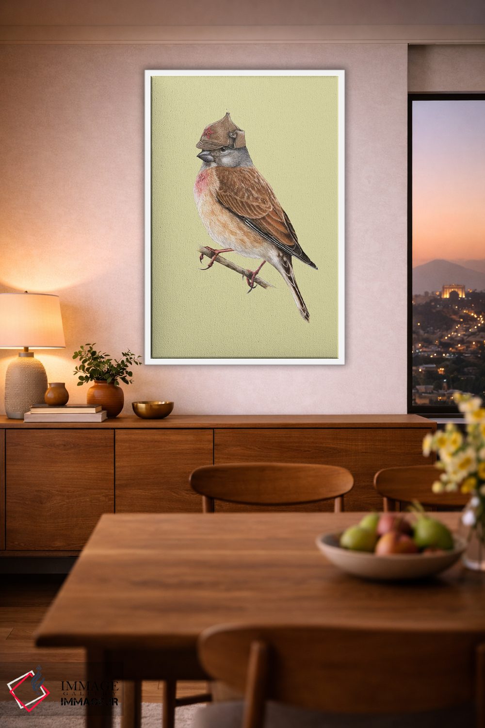 براساس پالت گرم اثر، قاب بلوط روشن (چوبی) پیشنهاد اول است و استخوانی ملایم مکمل. برای سفارشهای پروژهای با ابعاد و قابهای اختصاصی با ایماژ در تماس باشید.