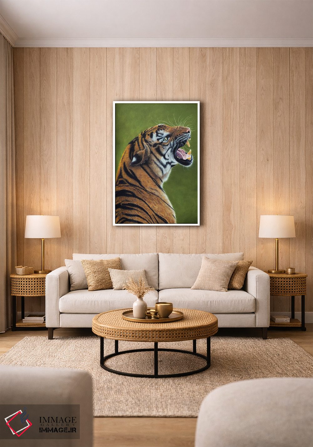 براساس پالت ترکیبی اثر، قاب تیک گرم (چوبی) پیشنهاد اول است و مشکی مات (فریم متوسط) مکمل. برای سفارشهای پروژهای با ابعاد و قابهای اختصاصی با ایماژ در تماس باشید.