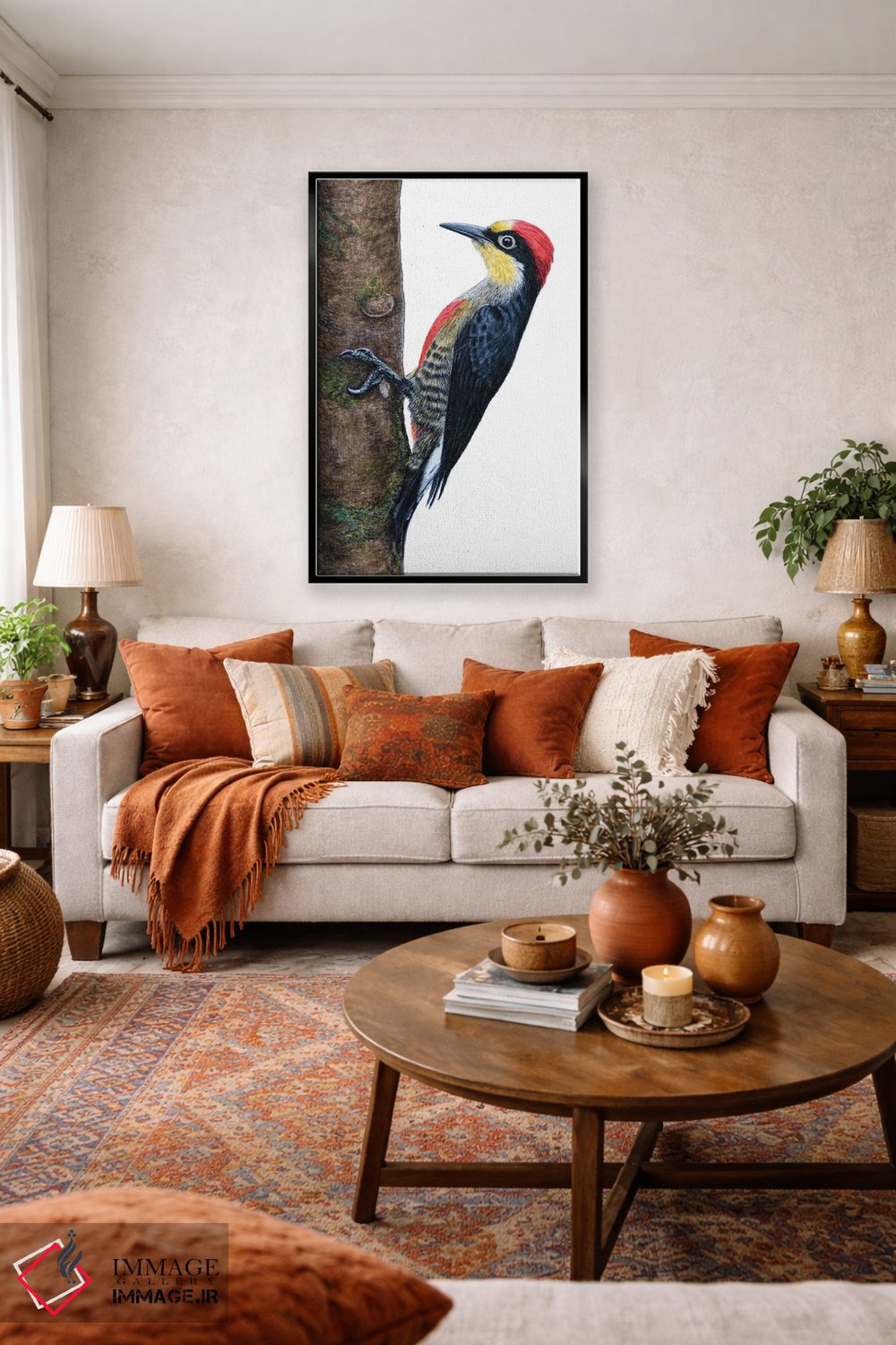 اگر به آثار حیوانات علاقه دارید، «"دارکوب پیشانی زرد"» اثرِ «میخائیل ودرنیکوف» در کنار رنگهای خنثی، تضاد دلچسبی میسازد، برای دیوار کنار میز کار گزینهٔ مناسبیست. هر بار نگاهش میکنید، یک جزئیات تازه به چشم میآید.