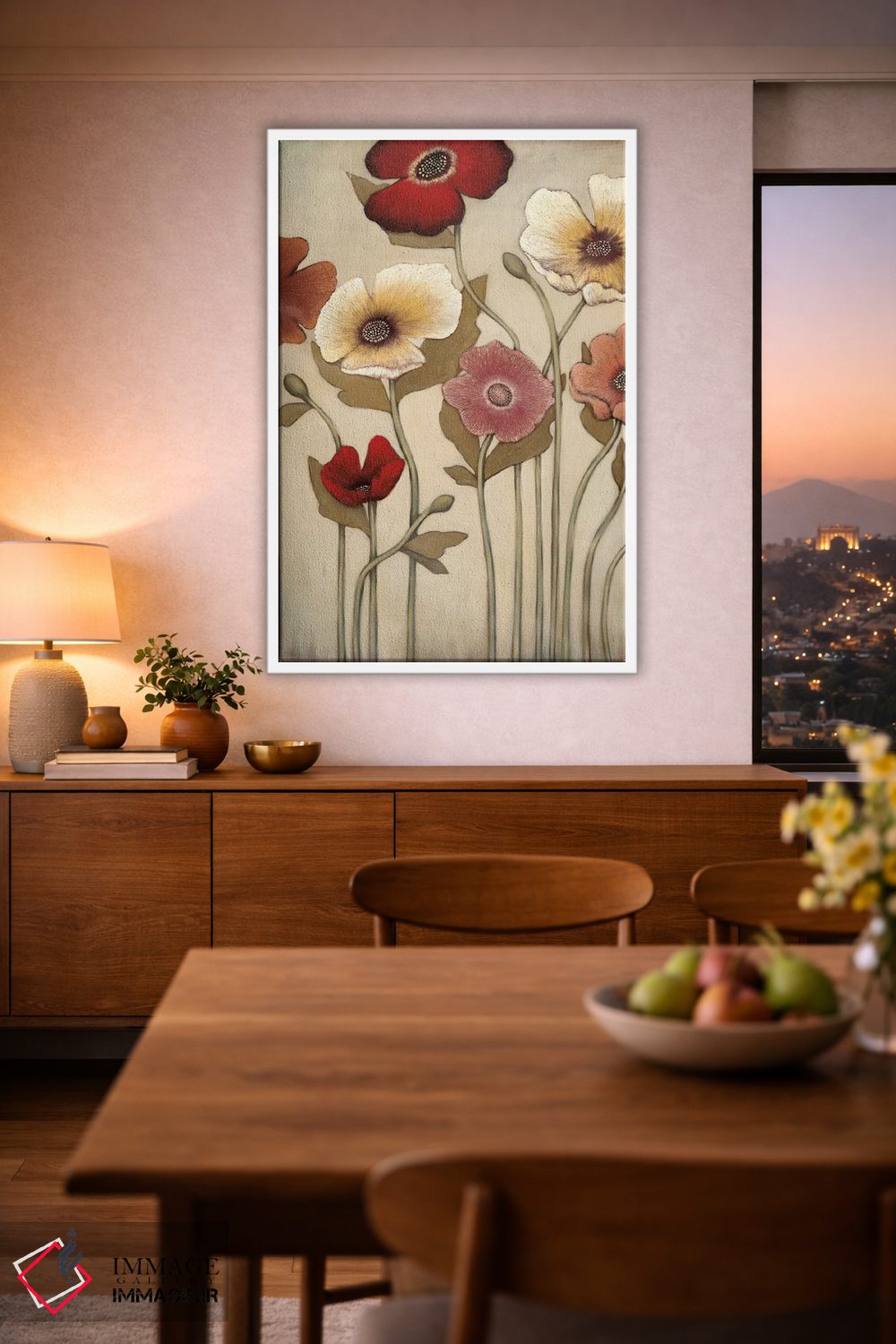 براساس پالت گرم اثر، قاب بلوط روشن (چوبی) پیشنهاد اول است و استخوانی ملایم مکمل. برای سفارشهای پروژهای با ابعاد و قابهای اختصاصی با ایماژ در تماس باشید.