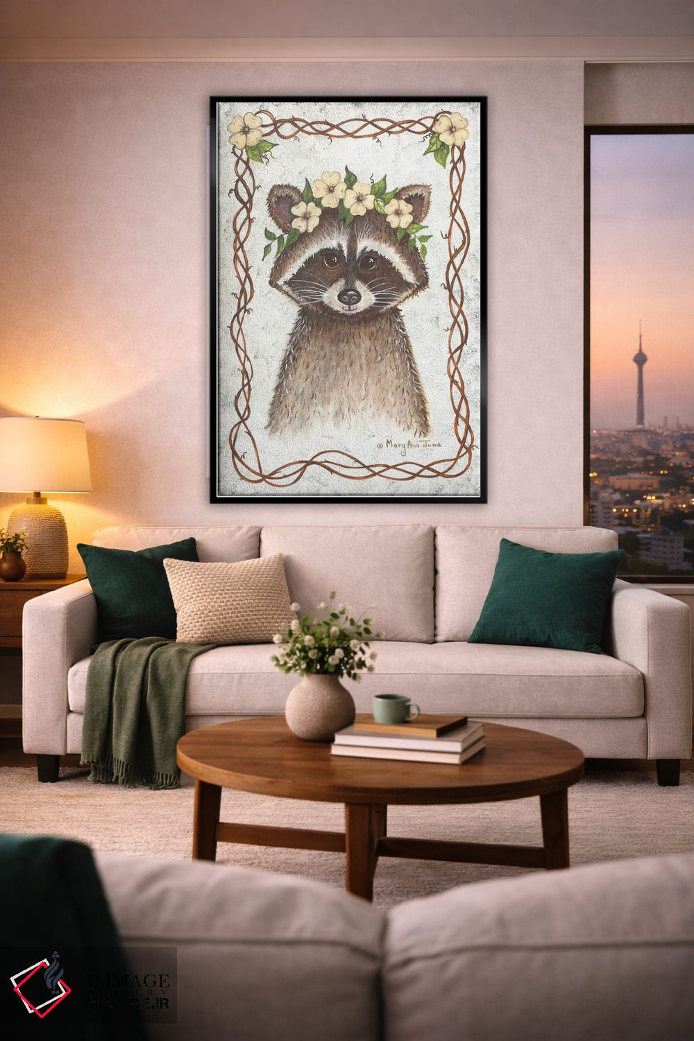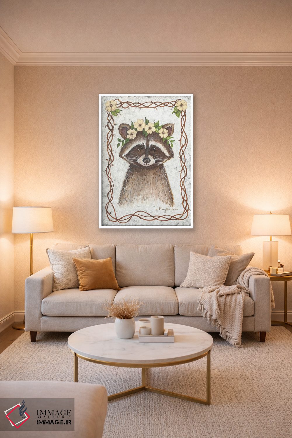 در «راکون» اثرِ «مری آن جون»، حضور حیوانات در کنار رنگهای خنثی، تضاد دلچسبی میسازد؛ برای نشیمنهای خانوادگی انتخابی خوشسلیقه است. برای دیوار گالریوار هم گزینهٔ خوبیست.