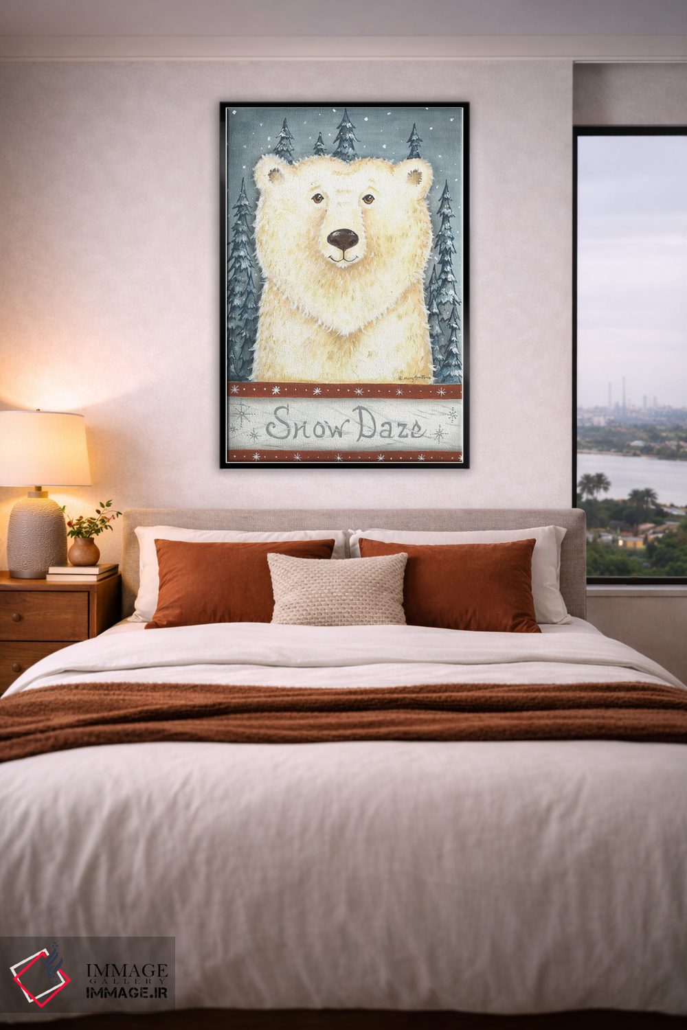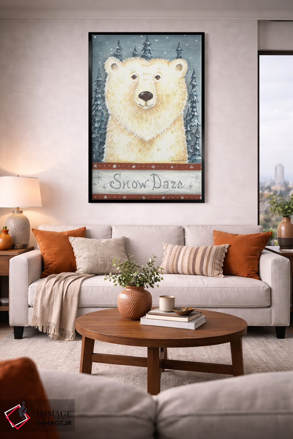 براساس پالت گرم اثر، قاب بلوط روشن (چوبی) پیشنهاد اول است و استخوانی ملایم مکمل. برای سفارشهای پروژهای با ابعاد و قابهای اختصاصی با ایماژ در تماس باشید.