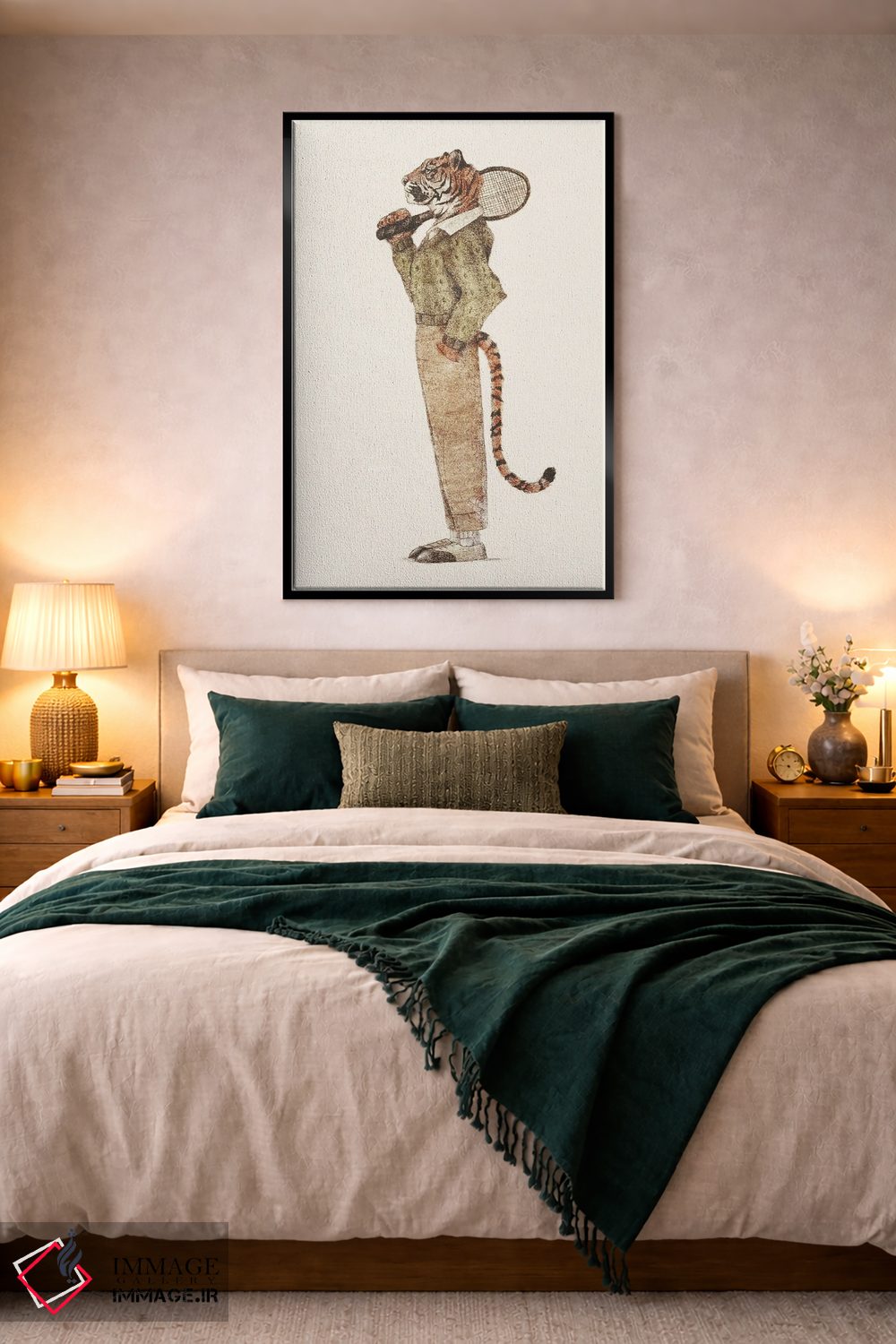 براساس پالت گرم اثر، قاب بلوط روشن (چوبی) پیشنهاد اول است و استخوانی ملایم مکمل. برای سفارشهای پروژهای با ابعاد و قابهای اختصاصی با ایماژ در تماس باشید.