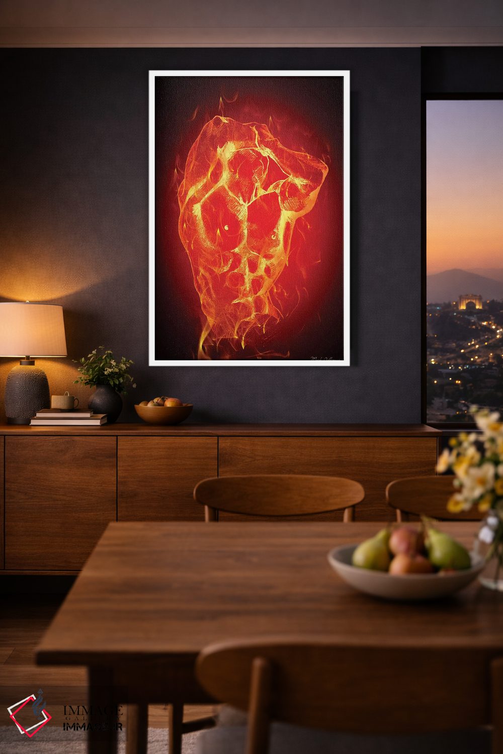 براساس پالت گرم اثر، قاب تیک گرم (چوبی) پیشنهاد اول است و مشکی مات (فریم متوسط) مکمل. برای سفارشهای پروژهای با ابعاد و قابهای اختصاصی با ایماژ در تماس باشید.