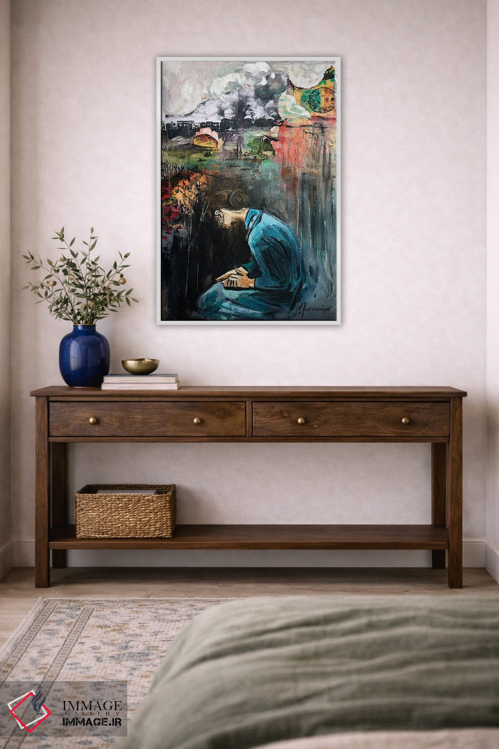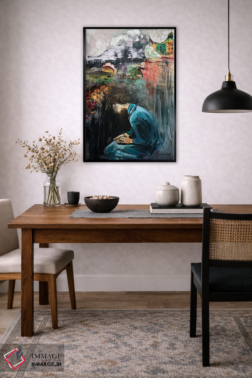 براساس پالت ترکیبی اثر، قاب تیک گرم (چوبی) پیشنهاد اول است و مشکی مات (فریم متوسط) مکمل. برای سفارشهای پروژهای با ابعاد و قابهای اختصاصی با ایماژ در تماس باشید.