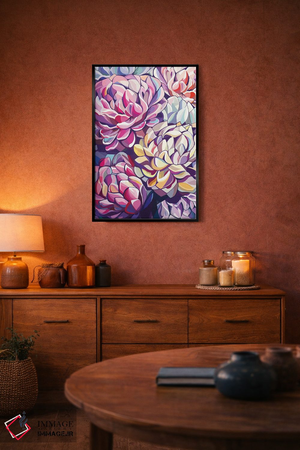 براساس پالت ترکیبی اثر، قاب تیک گرم (چوبی) پیشنهاد اول است و مشکی مات (فریم متوسط) مکمل. برای سفارشهای پروژهای با ابعاد و قابهای اختصاصی با ایماژ در تماس باشید.