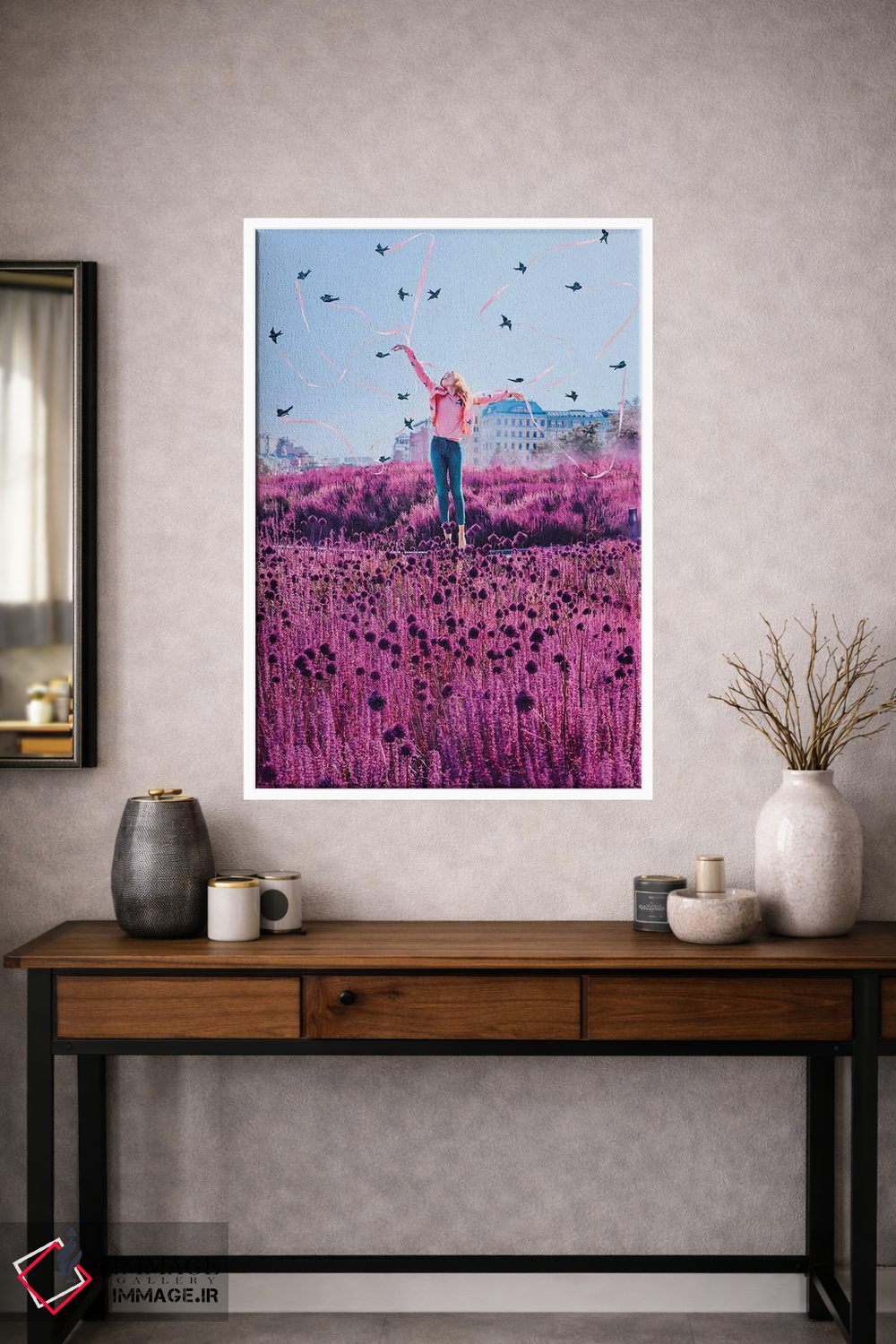 این تابلو با عنوان «پرستوها» اثرِ «هوبوپیبا (هنرمند دیجیتال)»، کنار آینه و رختکن یا اتاق لباس عالی مینشیند.