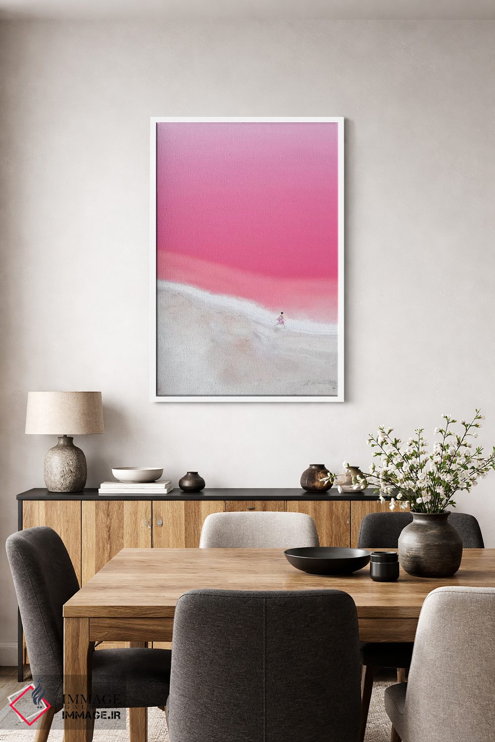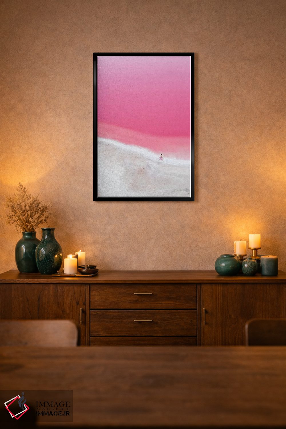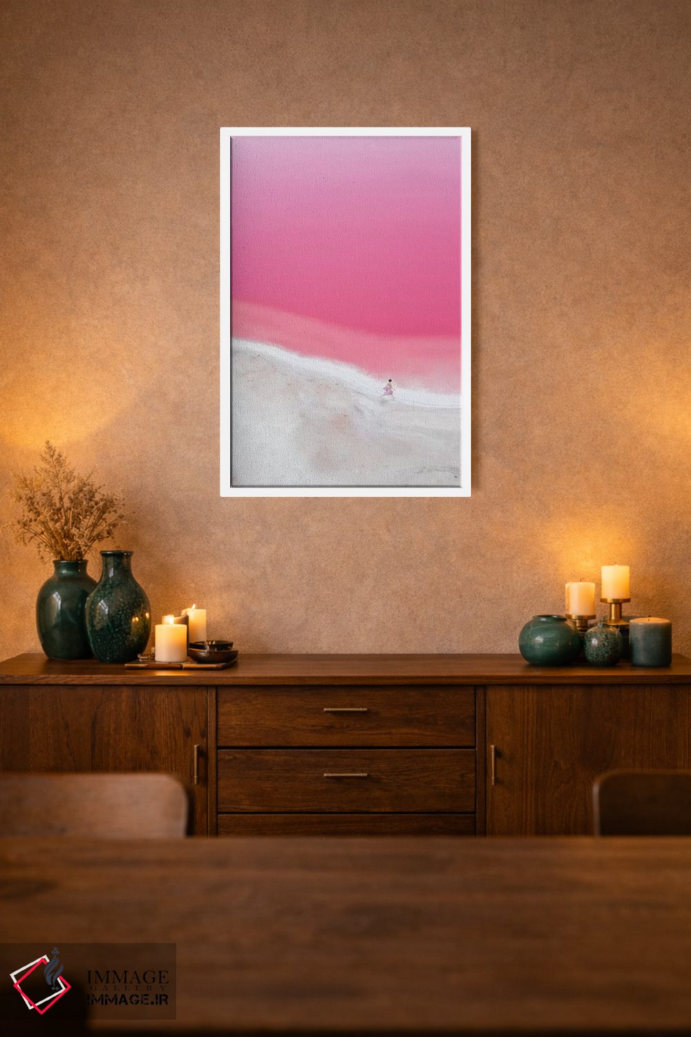 برای فضاهای آرام و مینیمال، یک منظرهی خوشساخت همیشه جواب میدهد—«حال و هوای صورتی در تالاب هات ۱» اثرِ «هوبوپیبا (هنرمند دیجیتال)».