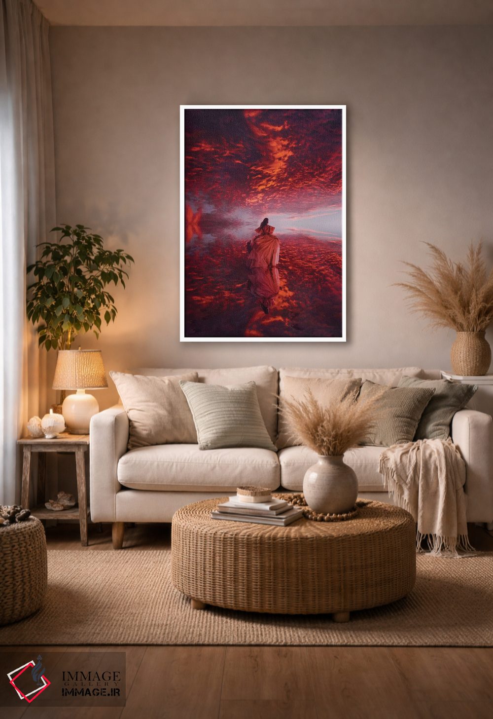 براساس پالت گرم اثر، قاب تیک گرم (چوبی) پیشنهاد اول است و مشکی مات (فریم متوسط) مکمل. برای سفارشهای پروژهای با ابعاد و قابهای اختصاصی با ایماژ در تماس باشید.