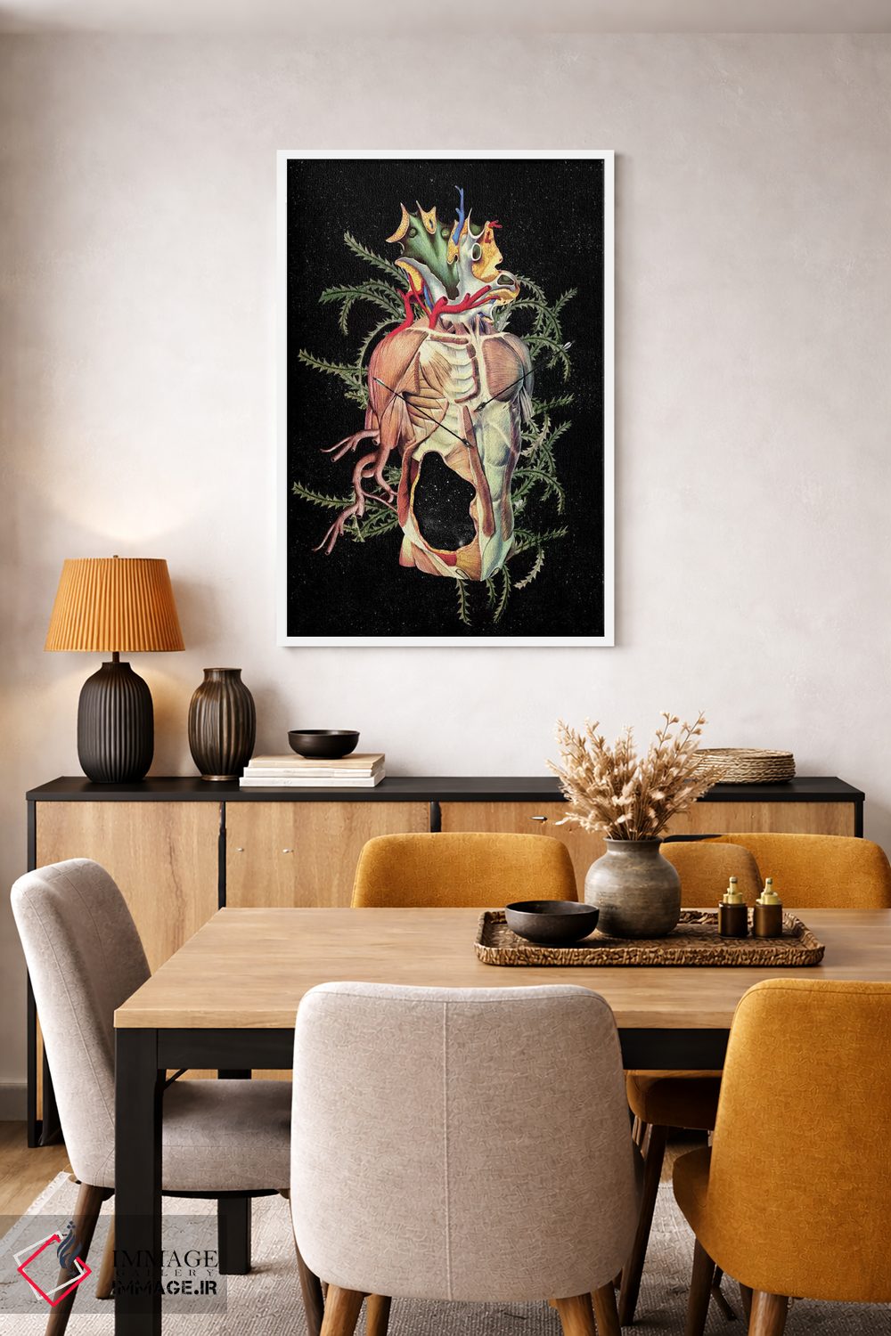 براساس پالت گرم اثر، قاب تیک گرم (چوبی) پیشنهاد اول است و مشکی مات (فریم متوسط) مکمل. برای سفارشهای پروژهای با ابعاد و قابهای اختصاصی با ایماژ در تماس باشید.