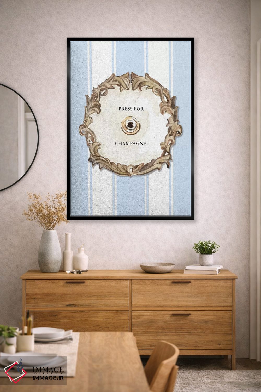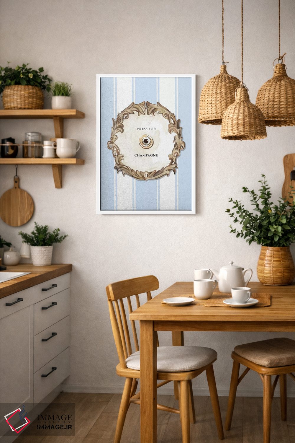 براساس پالت گرم اثر، قاب بلوط روشن (چوبی) پیشنهاد اول است و استخوانی ملایم مکمل. برای سفارشهای پروژهای با ابعاد و قابهای اختصاصی با ایماژ در تماس باشید.