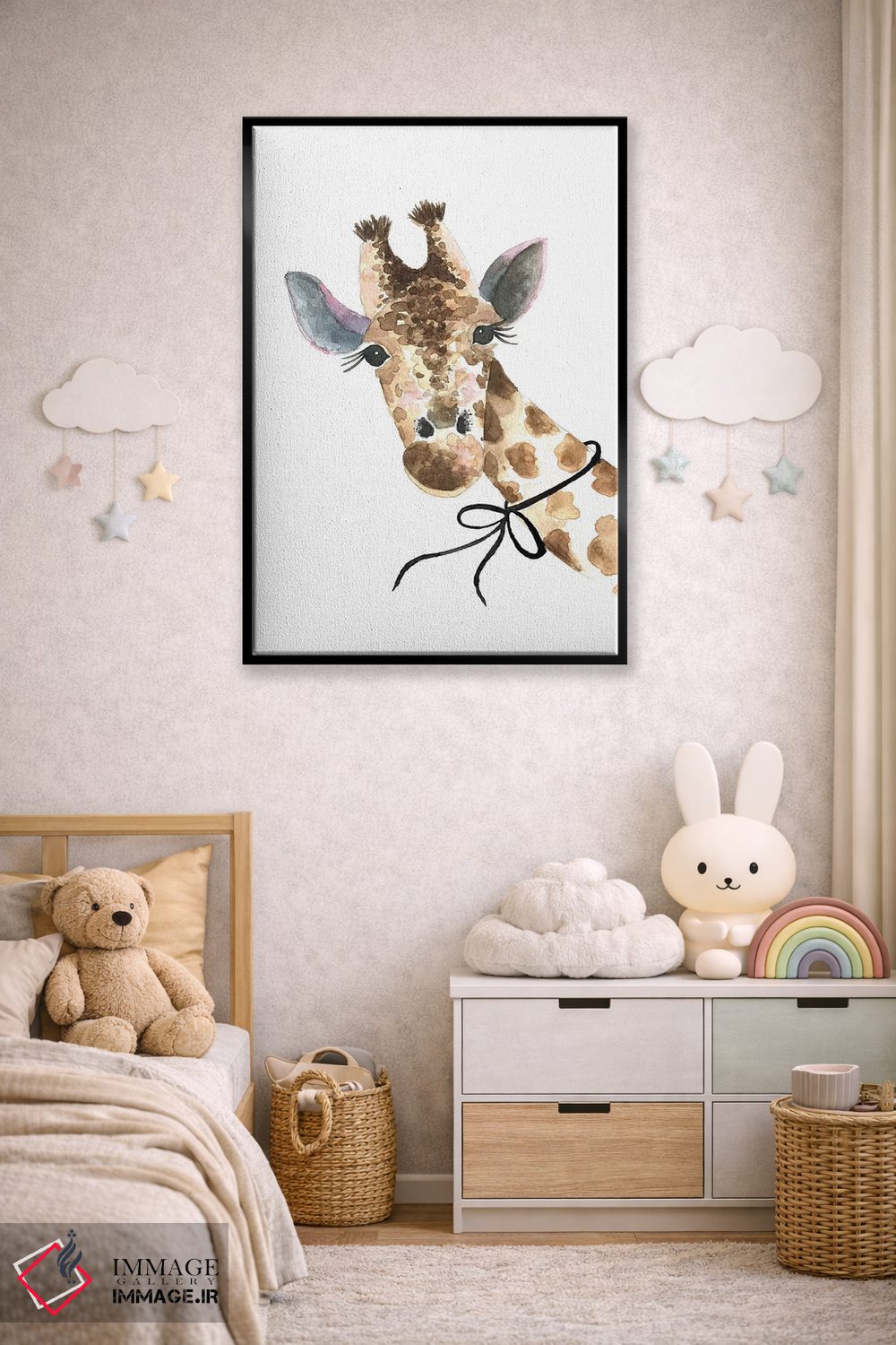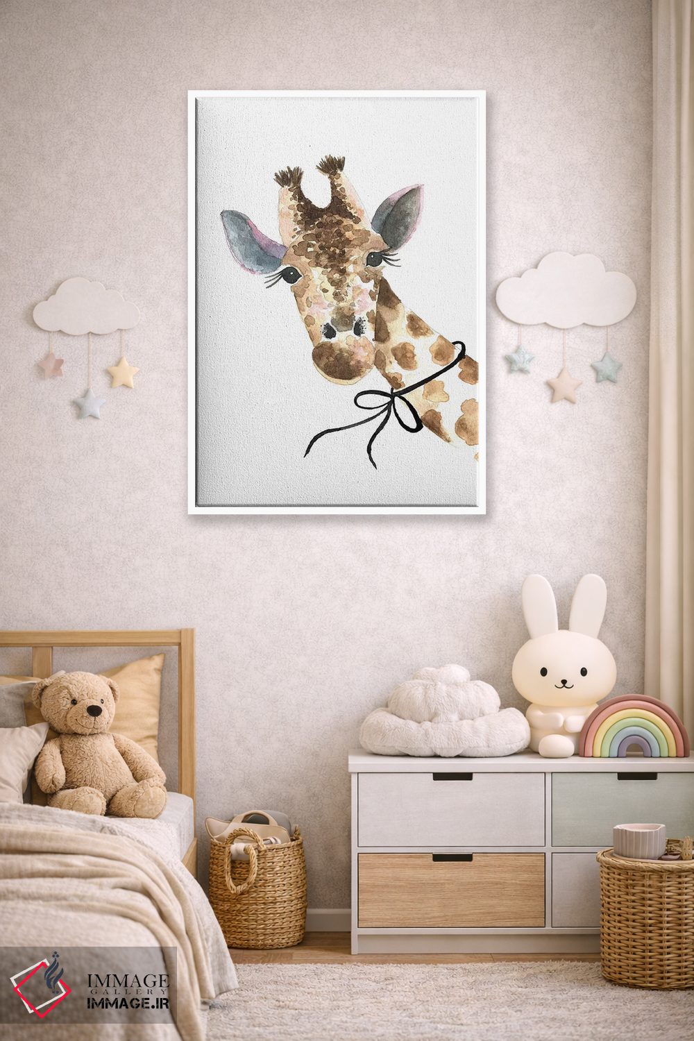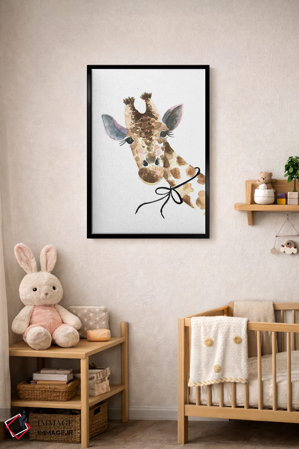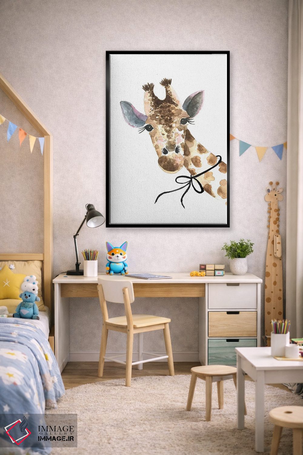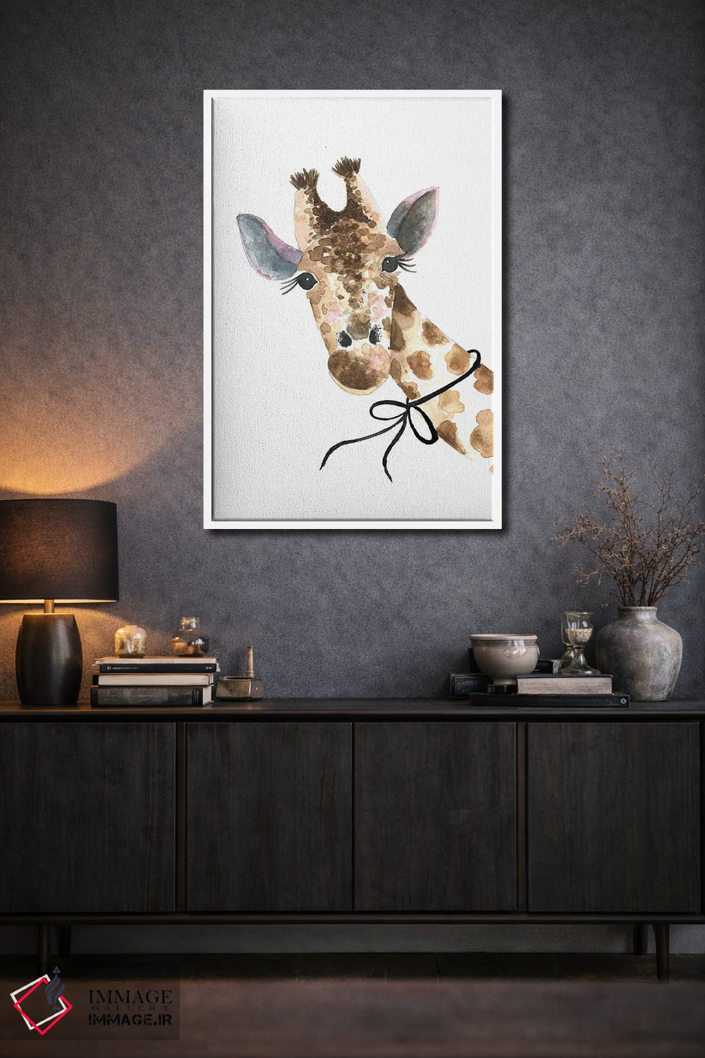 تابلو دکوراتیو زرافه با پاپیون اثر مرسدس لوپز چارو - نمای روبه‌رو روی دیوار