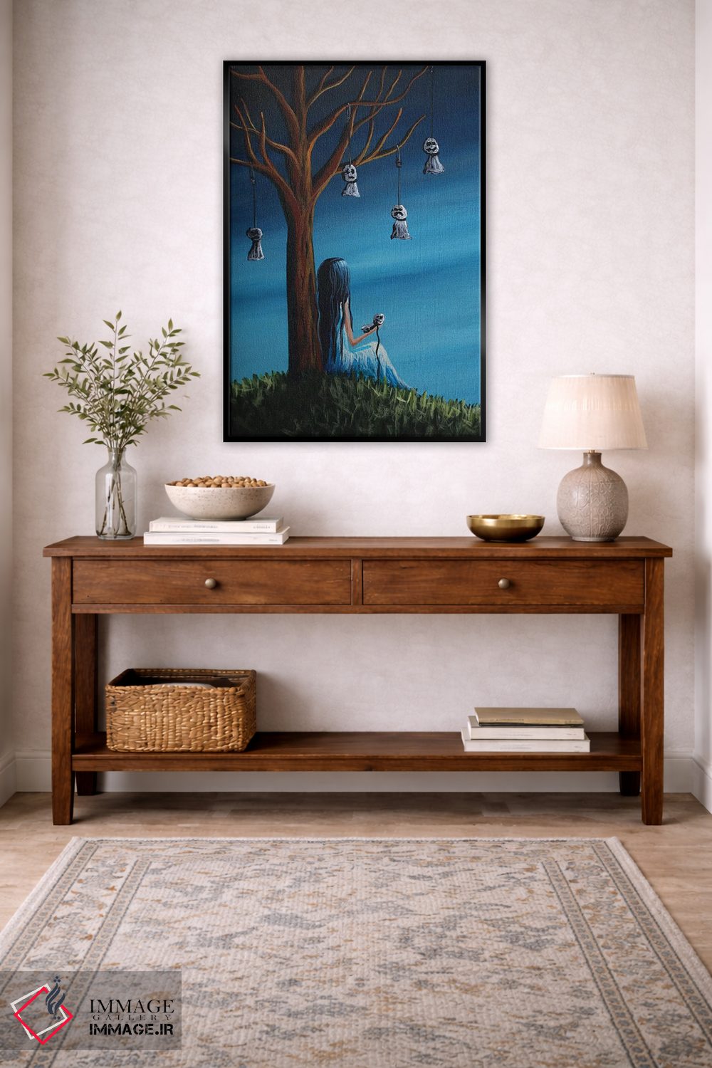 «اینجا آنقدرها هم جای تنهایی نیست» اثرِ «سالن هنری مونلایت» از آن انتخابهاییست که به دیوار، شخصیت و جهت میدهد؛ برای دکورهای کلاسیک با چوب و پارچه انتخابی عالی است. فضا را شلوغ نمیکند؛ فقط دقیقترش میکند.