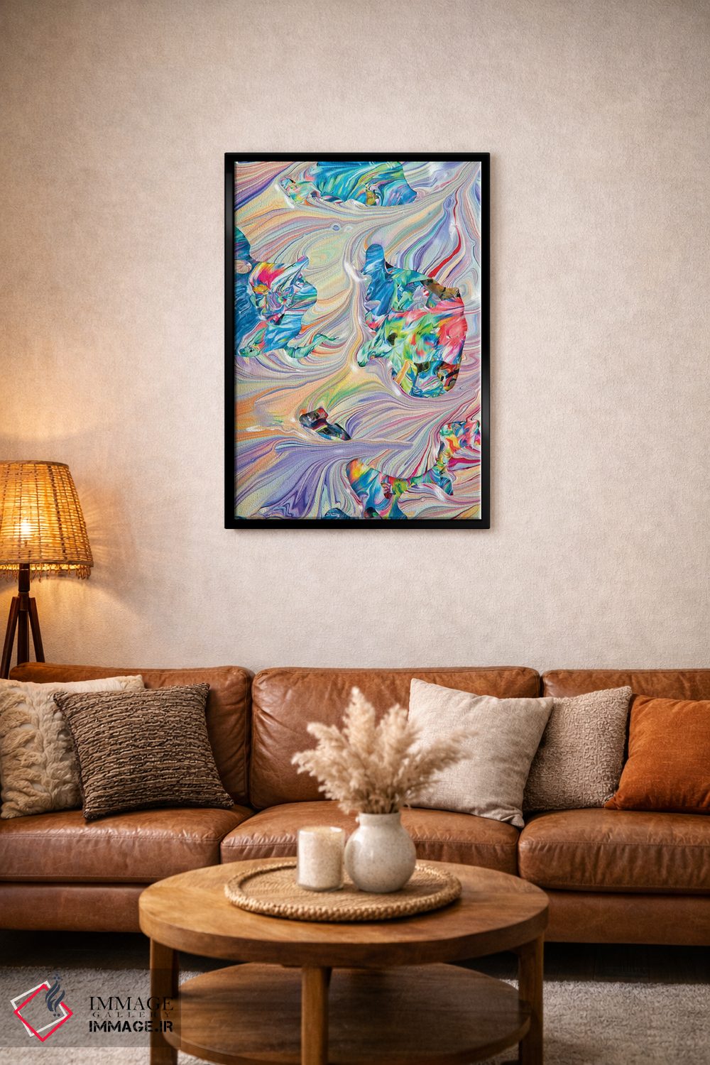 براساس پالت ترکیبی اثر، قاب تیک گرم (چوبی) پیشنهاد اول است و مشکی مات (فریم متوسط) مکمل. برای سفارشهای پروژهای با ابعاد و قابهای اختصاصی با ایماژ در تماس باشید.