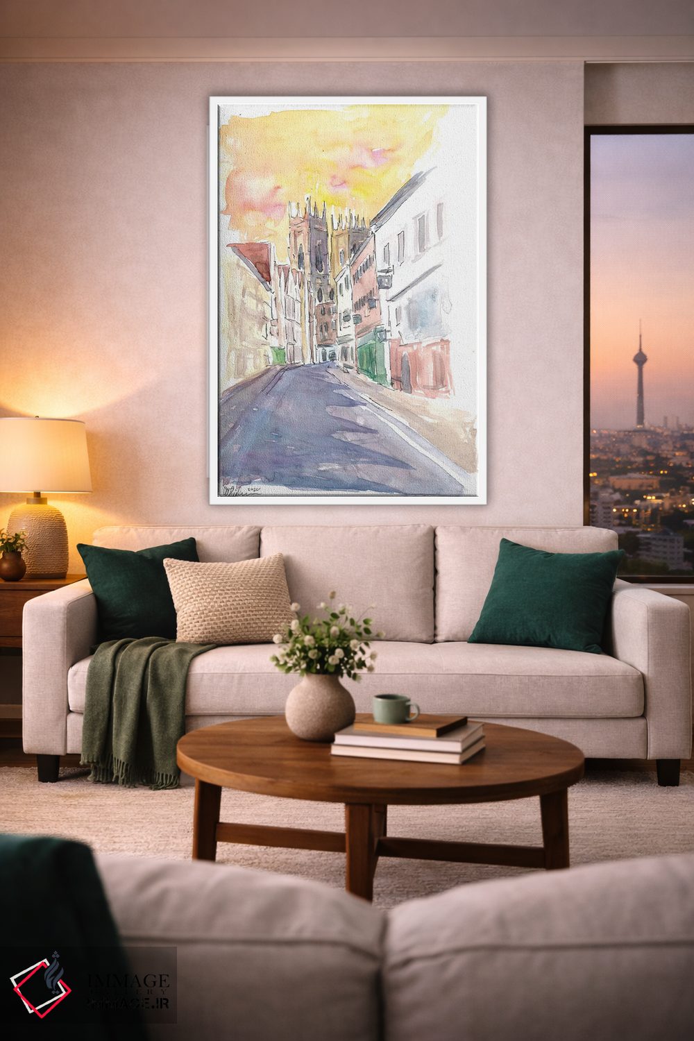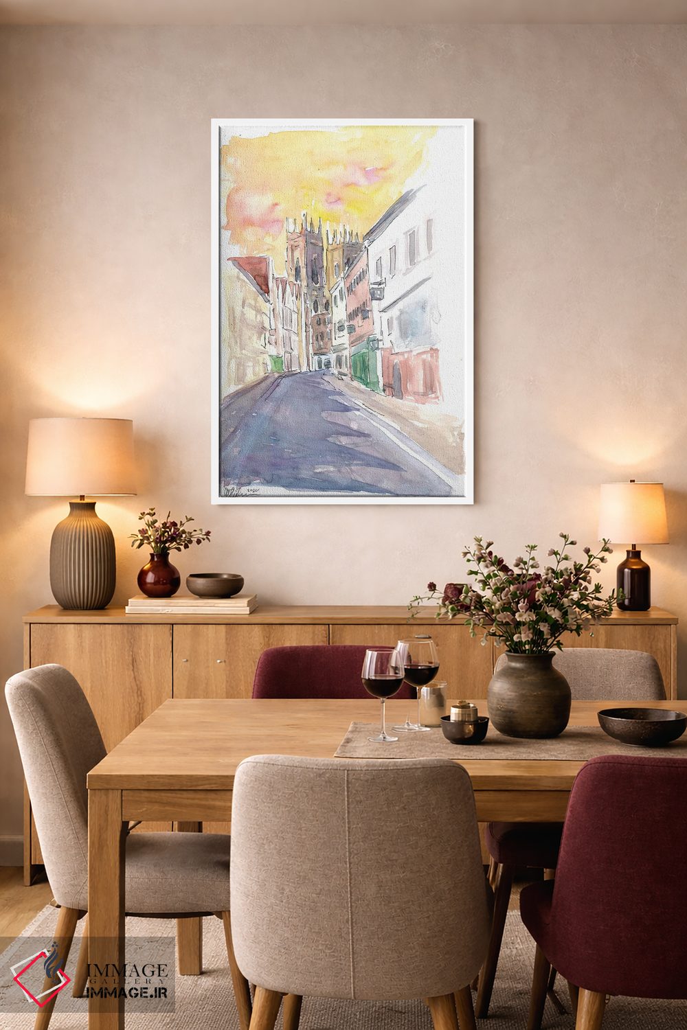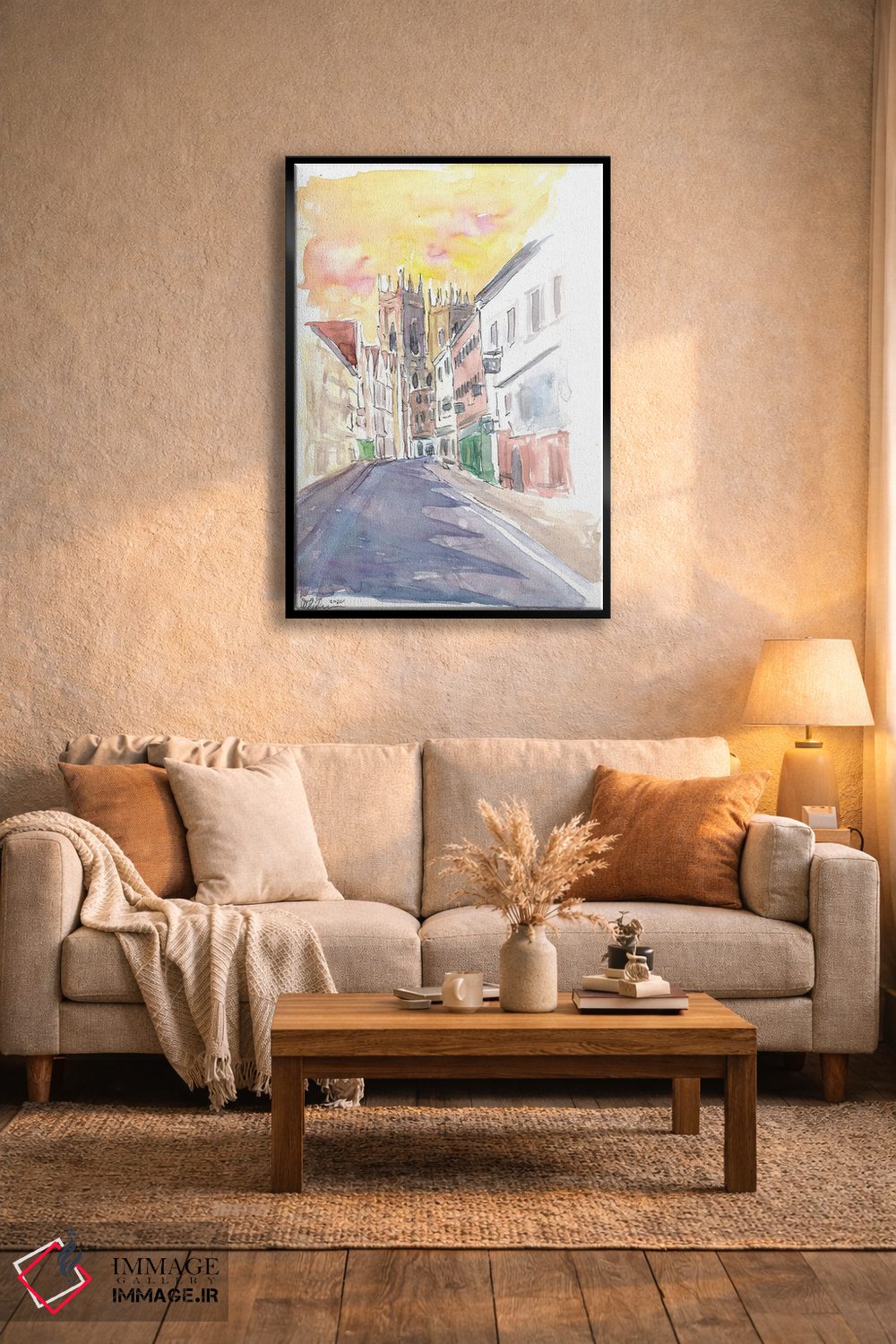براساس پالت گرم اثر، قاب بلوط روشن (چوبی) پیشنهاد اول است و استخوانی ملایم مکمل. برای سفارشهای پروژهای با ابعاد و قابهای اختصاصی با ایماژ در تماس باشید.