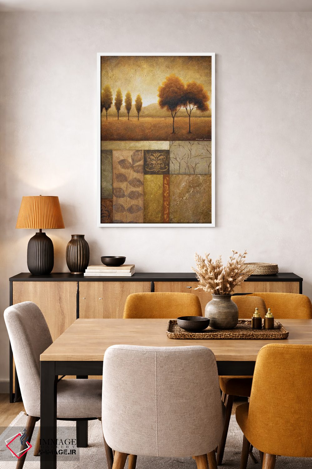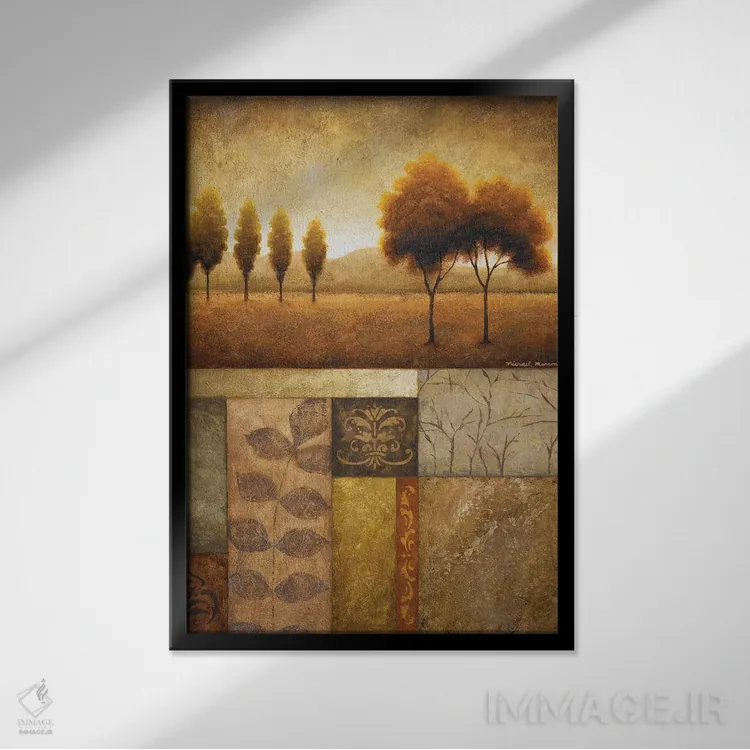 براساس پالت گرم اثر، قاب تیک گرم (چوبی) پیشنهاد اول است و مشکی مات (فریم متوسط) مکمل. برای سفارشهای پروژهای با ابعاد و قابهای اختصاصی با ایماژ در تماس باشید.