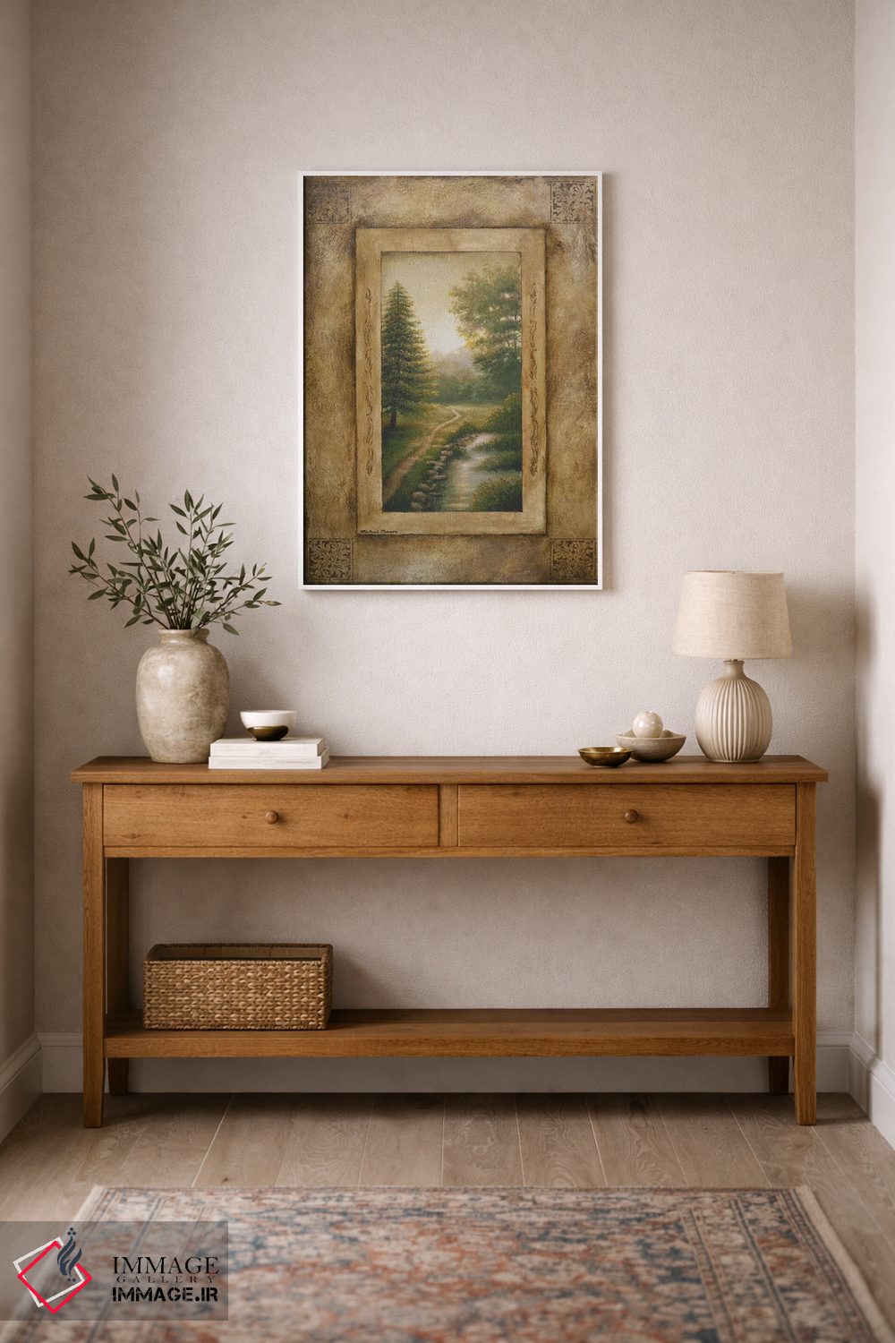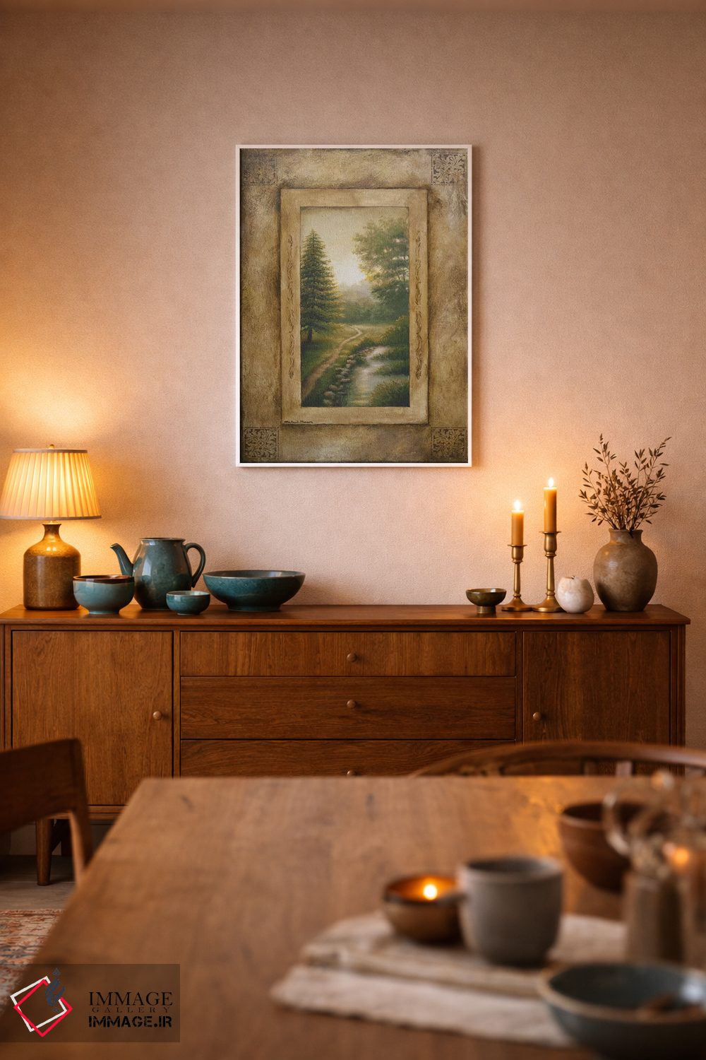 براساس پالت ترکیبی اثر، قاب بلوط روشن (چوبی) پیشنهاد اول است و استخوانی ملایم مکمل. برای سفارشهای پروژهای با ابعاد و قابهای اختصاصی با ایماژ در تماس باشید.