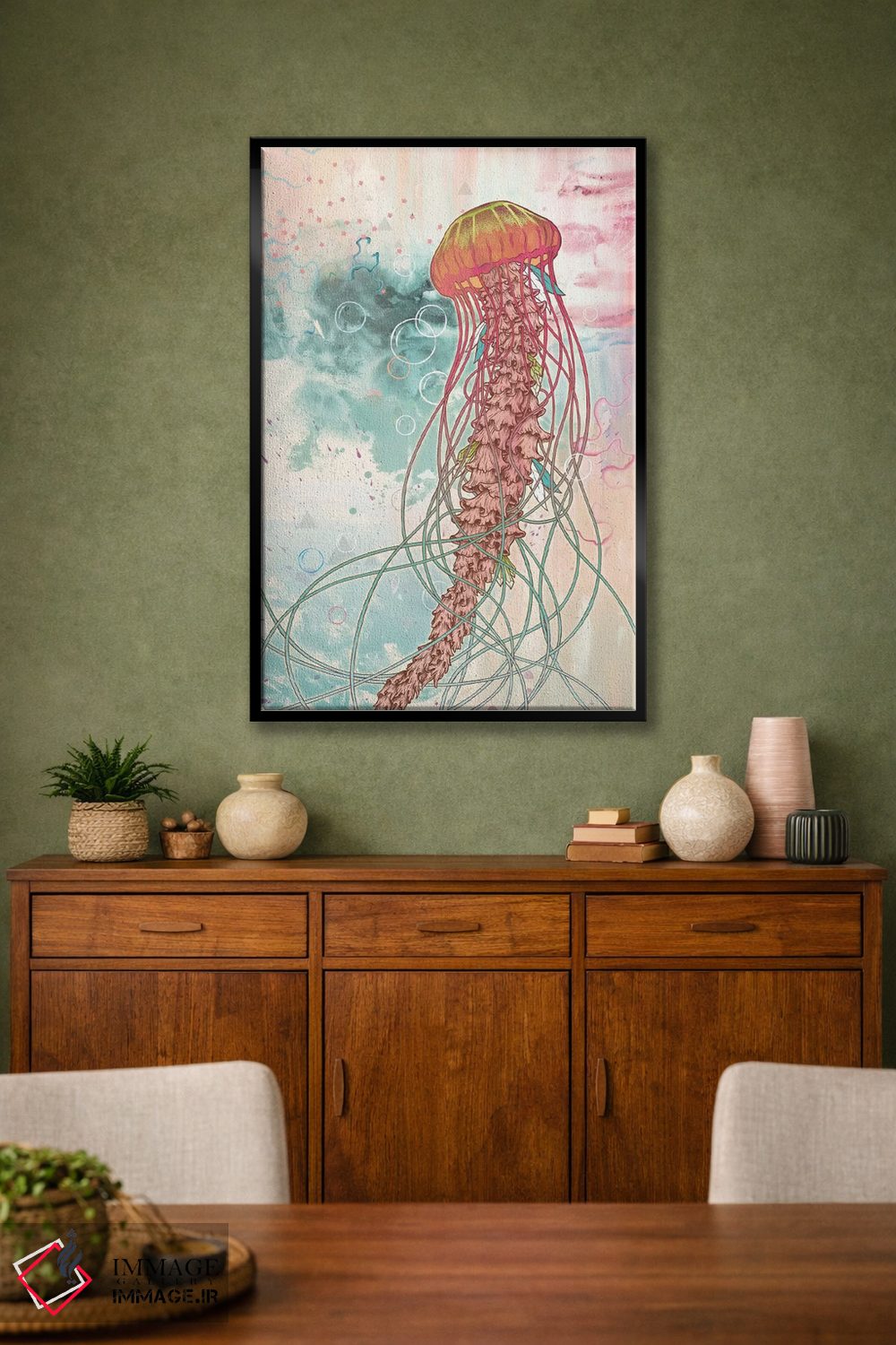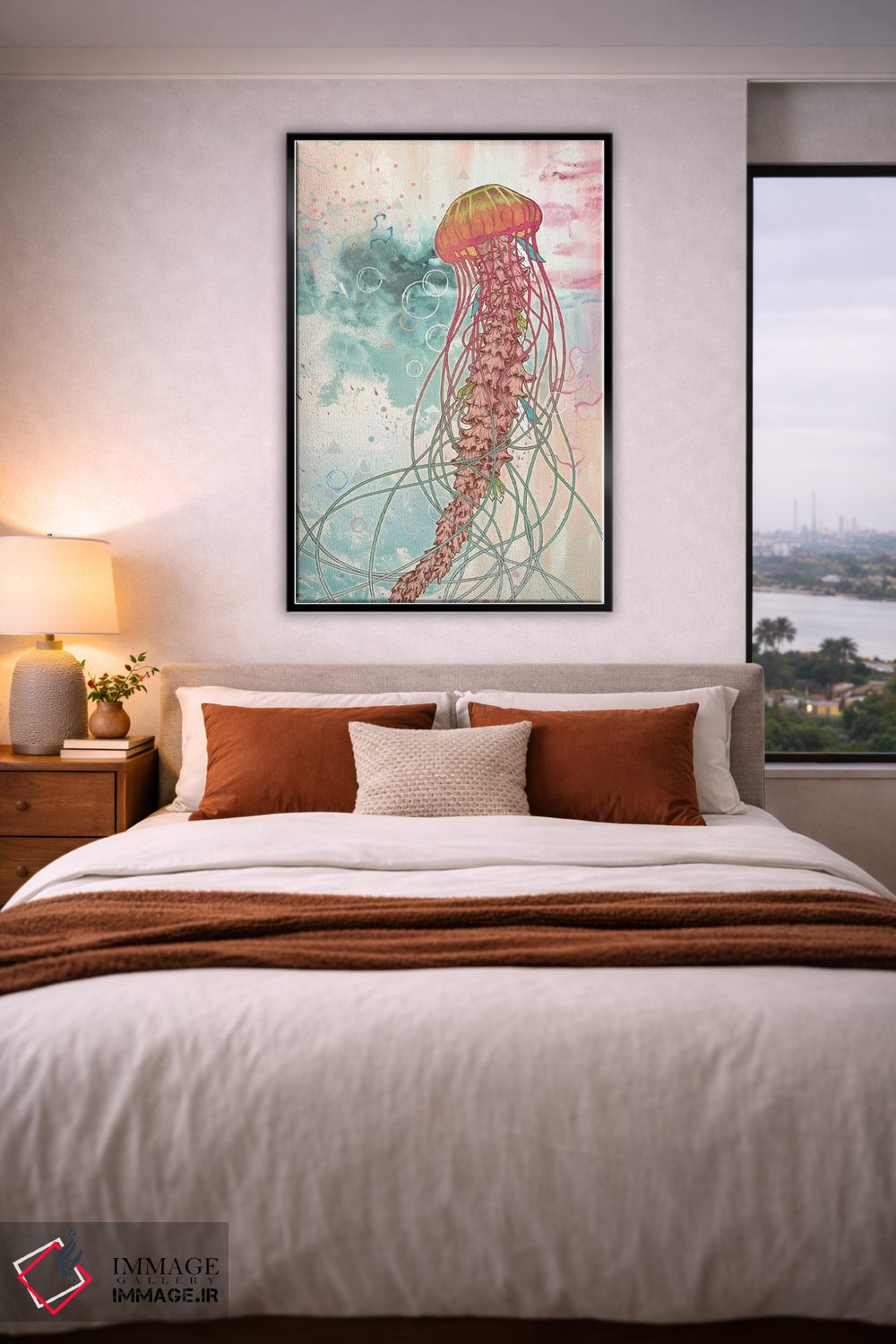 این اثر با عنوان «عروس دریایی» اثرِ «مت میلر» در کنار رنگهای خنثی، تضاد دلچسبی میسازد؛ برای دیوار کنار میز کار انتخابی خوشسلیقه است. در کنار گیاهان و نور طبیعی، جذابتر هم میشود.