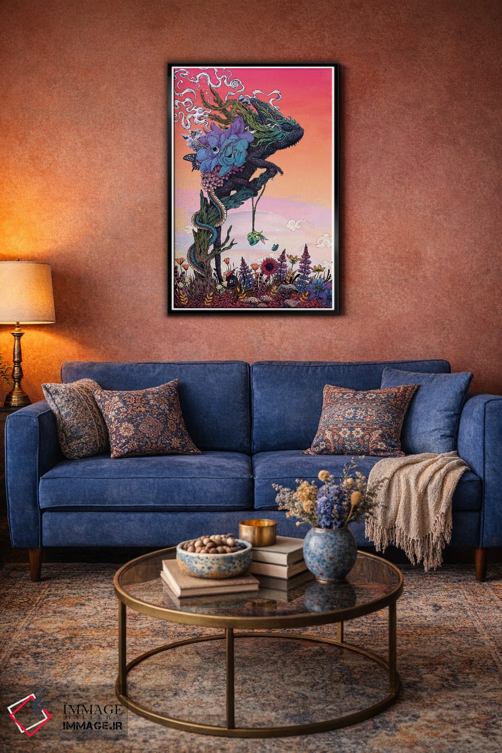 براساس پالت ترکیبی اثر، قاب تیک گرم (چوبی) پیشنهاد اول است و مشکی مات (فریم متوسط) مکمل. برای سفارشهای پروژهای با ابعاد و قابهای اختصاصی با ایماژ در تماس باشید.